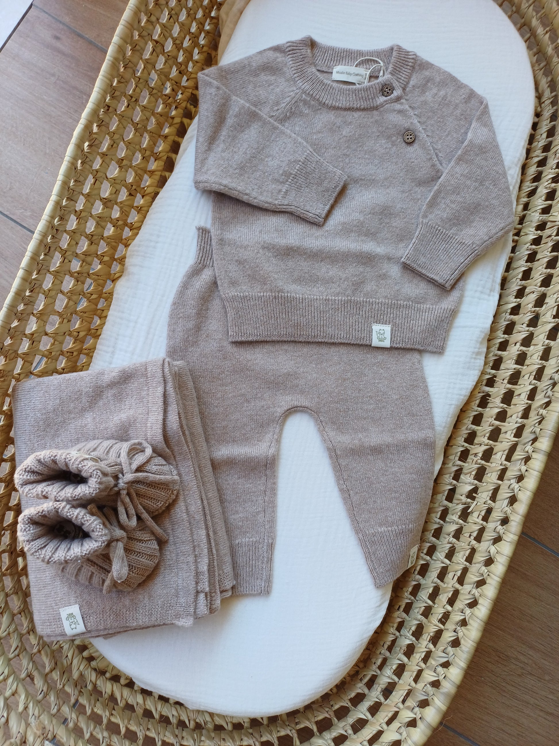 Dolcissime babbucce in lana merino e cashmere color beige, soffici e calde. Decorate con delicati laccetti che si annodano sul davanti formando un fiocchetto. Perfette per coccolare i piedini con eleganza e morbidezza.