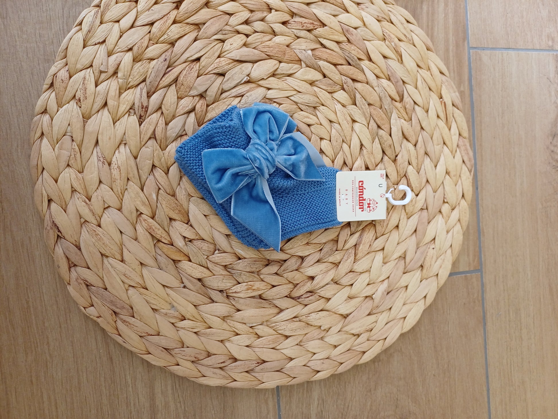 Babbucce taglia unica in morbido tessuto blu cobalto, con fiocchi in velluto applicati sui lati esterni. Confortevoli e avvolgenti, uniscono eleganza e praticità, ideali per mantenere caldi i piedini con stile raffinato e un tocco giocoso.