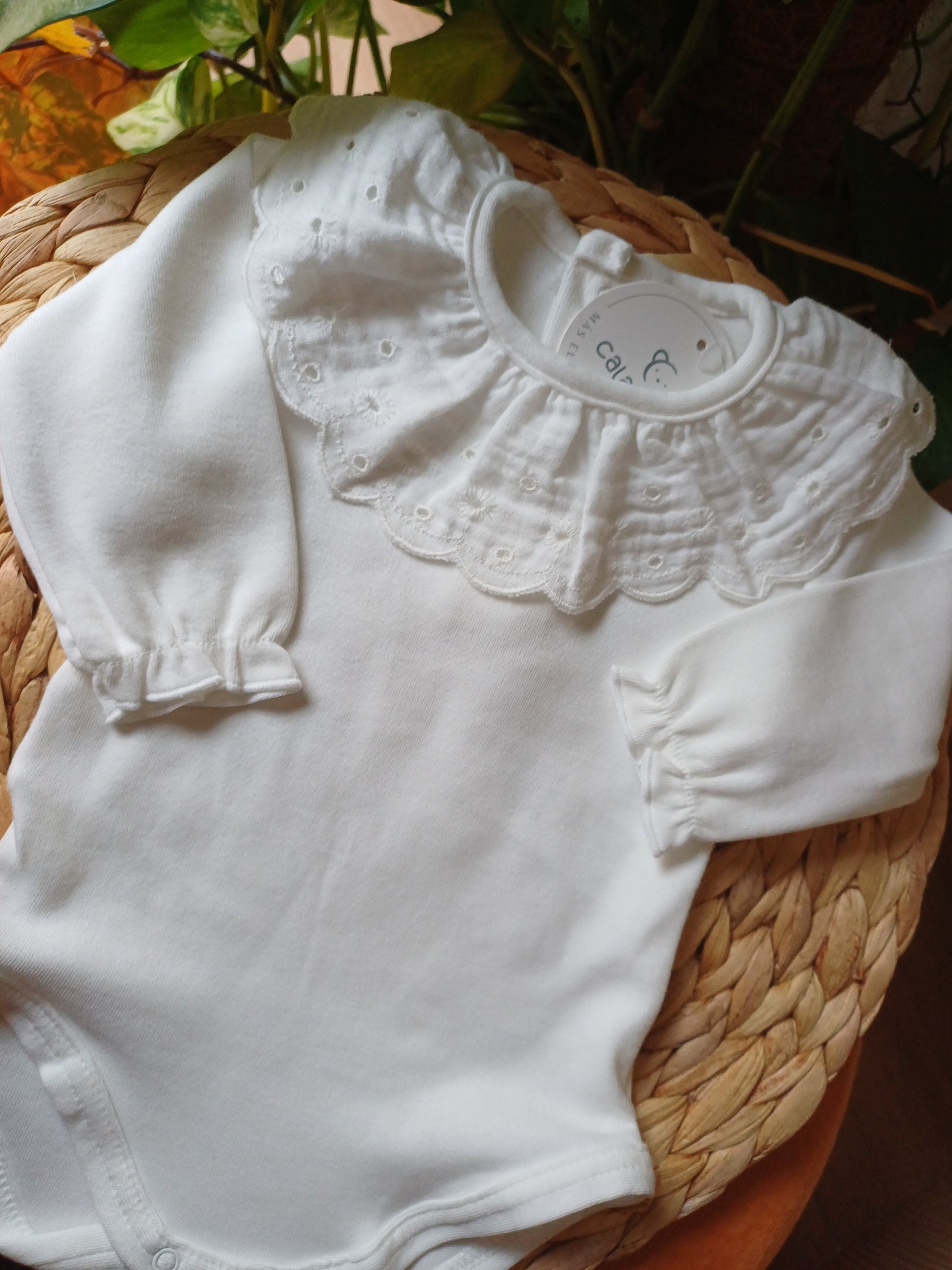 Body color latte con raffinato colletto in pizzo San Gallo, elegante e delicato. Realizzato in morbido cotone, offre comfort e dolcezza sulla pelle del neonato. Perfetto per occasioni speciali o per un look quotidiano curato, unisce semplicità e raffinatezza senza tempo.