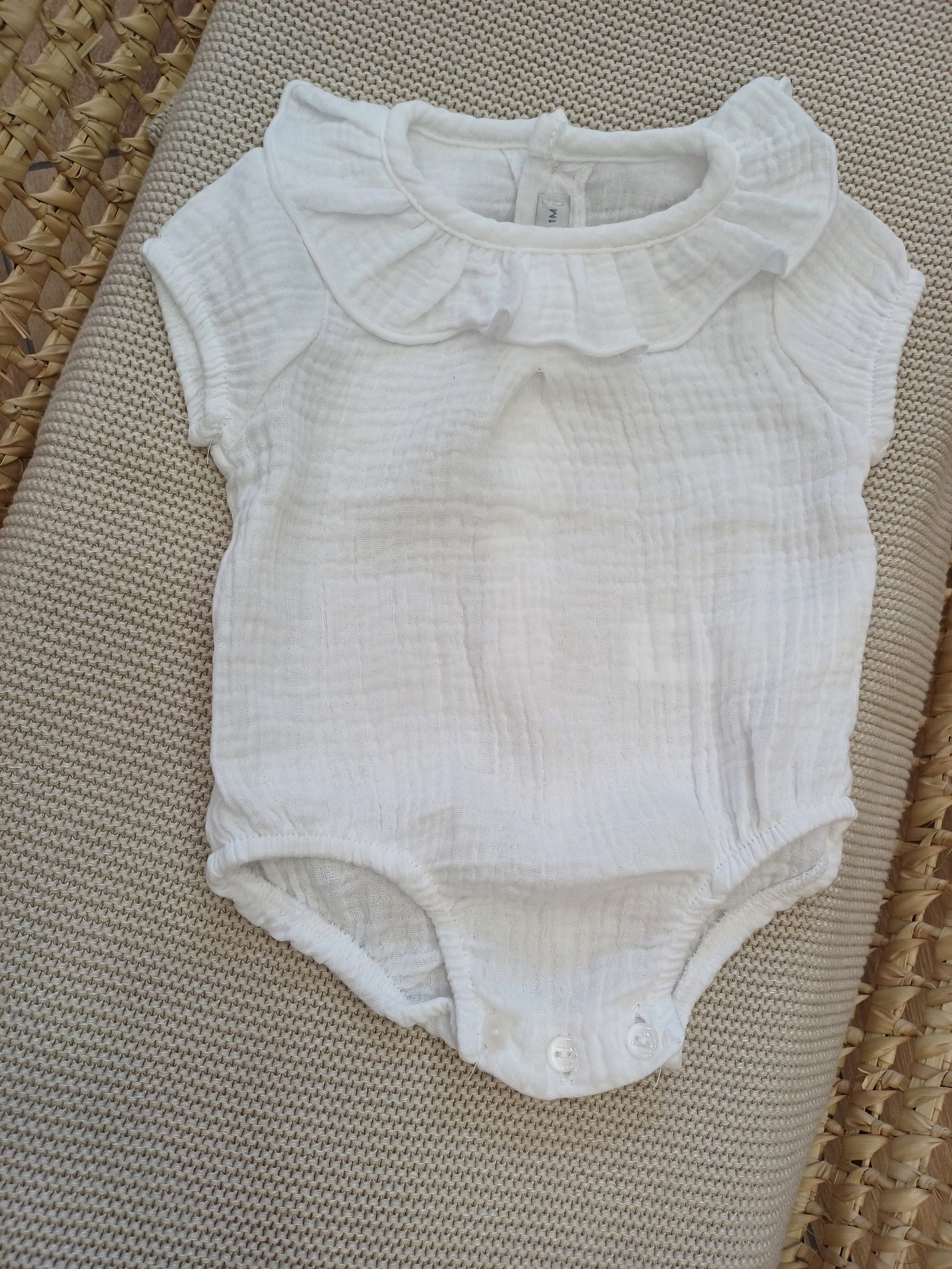 Delicato body a manica corta in morbida mussola, impreziosito da un romantico colletto con rouches. Elegante e confortevole, è perfetto per donare un tocco raffinato al look quotidiano. Chiusura con bottoncini per una vestibilità pratica e comoda.