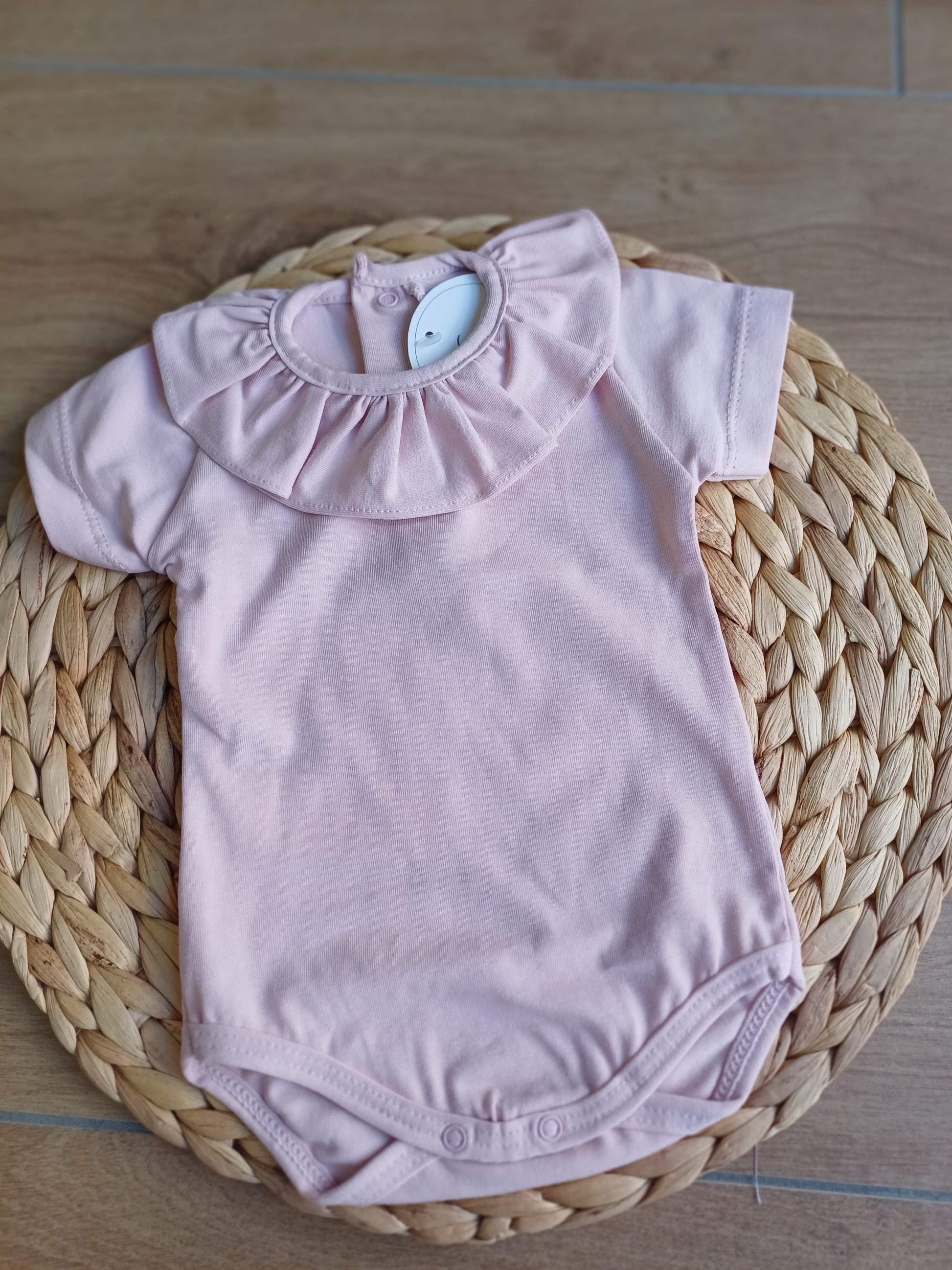 Delicato body rosa a manica corta in morbido cotone, impreziosito da un romantico colletto con rouches. Elegante e confortevole, è perfetto per donare un tocco raffinato al look quotidiano. Chiusura con bottoncini per una vestibilità pratica e comoda.