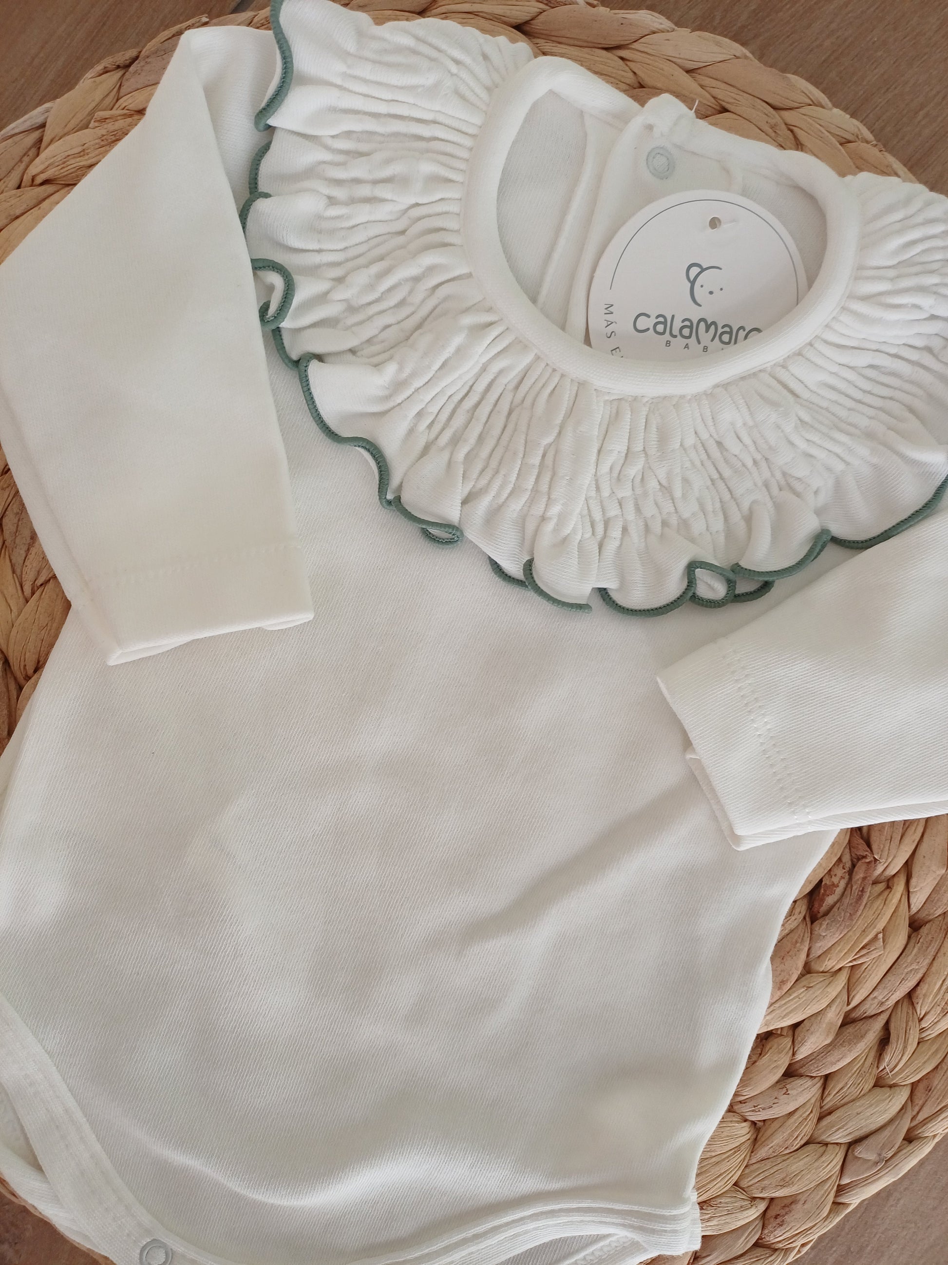 Body bianco latte a manica lunga, con rouches arricciata sul collo e delicata bordura verde. Realizzato in morbido cotone, unisce comfort e stile. Perfetto per donare un tocco romantico e raffinato al neonato, ideale per occasioni speciali o per completare outfit eleganti quotidiani.