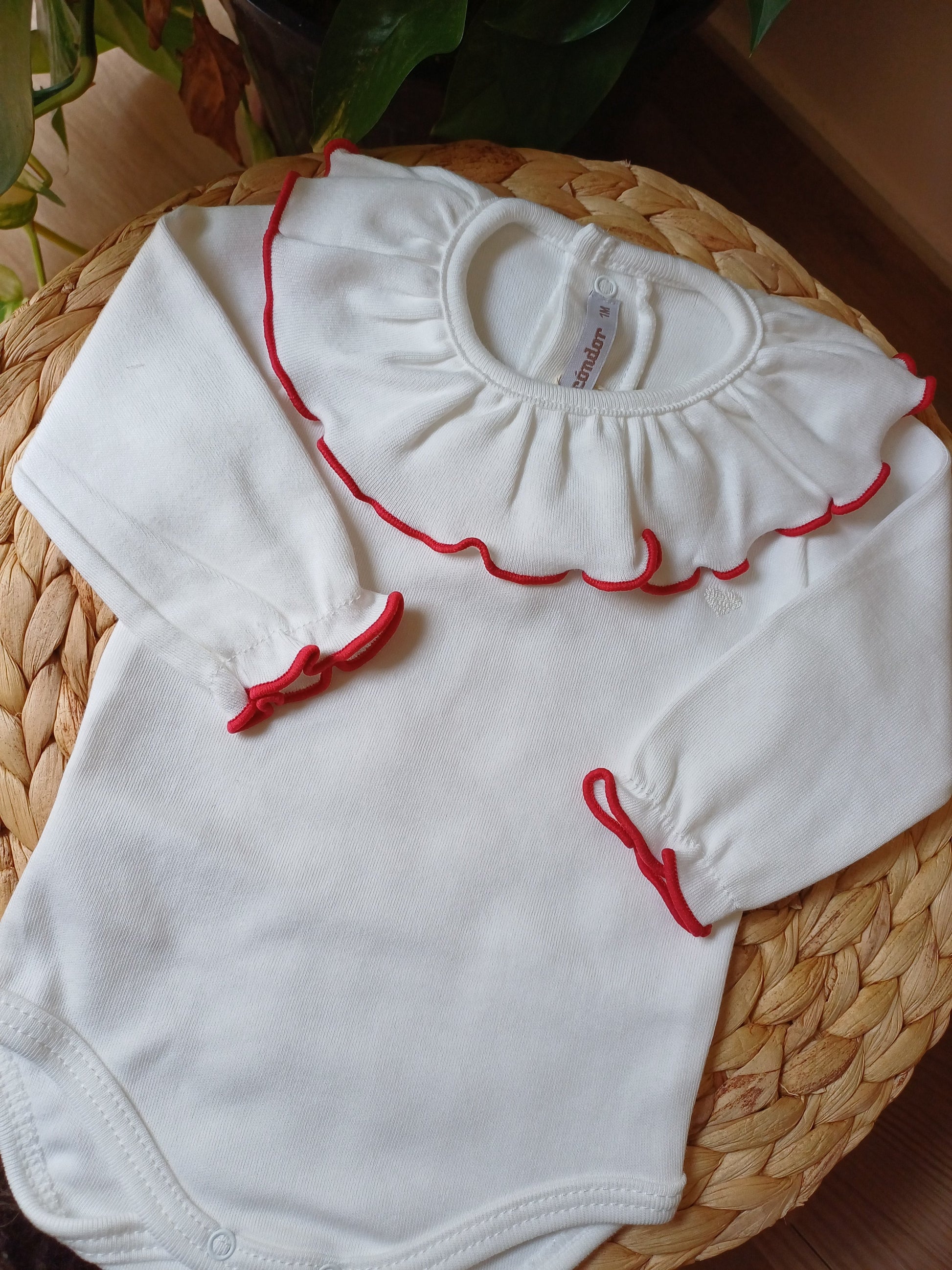 Body a manica lunga con rouches al collo, arricchito da bordura rossa delicata, ripresa anche sui polsi. Realizzato in morbido cotone, garantisce comfort e libertà di movimento. Elegante e raffinato, è perfetto per occasioni speciali o per aggiungere un tocco di colore discreto al neonato.