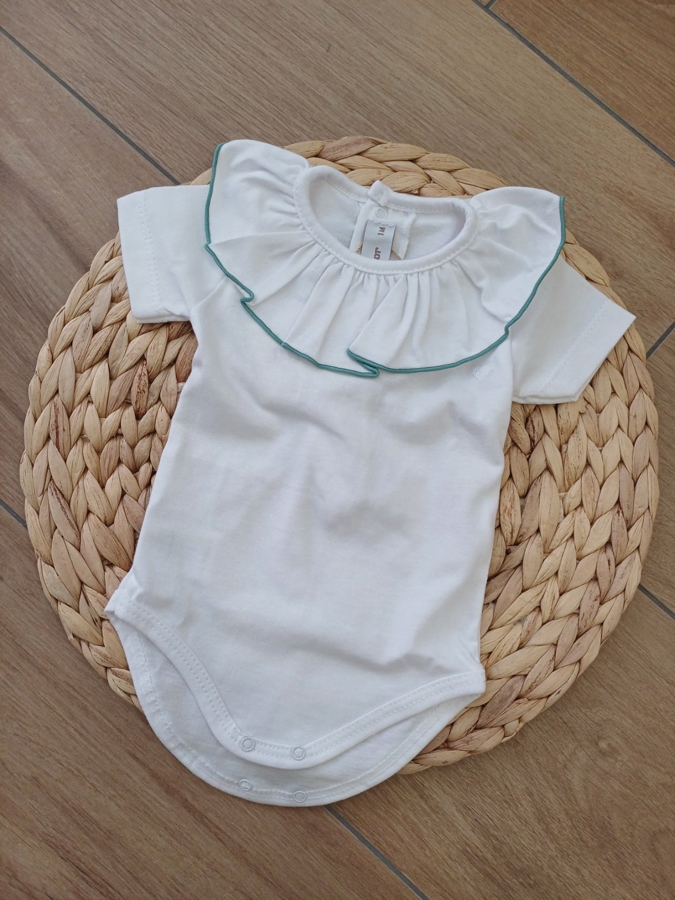 Body a maniche corte in morbido cotone, impreziosito da una romantica rouche sul collo che dona eleganza e dolcezza. Perfetto da solo o abbinato ad altri capi, unisce comfort e stile per un look delicato e raffinato, ideale in ogni occasione.