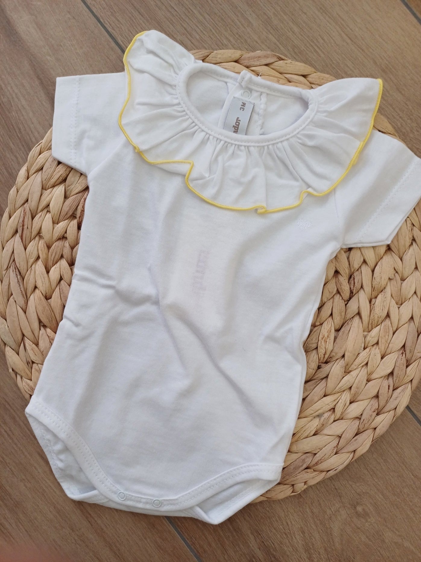 Body in morbido cotone con rouches colorata, ideale per aggiungere un tocco di allegria e stile al guardaroba del neonato. Leggero e traspirante, assicura massimo comfort durante tutta la giornata. La pratica chiusura con bottoncini facilita il cambio, rendendolo perfetto per l’uso quotidiano e per occasioni speciali.