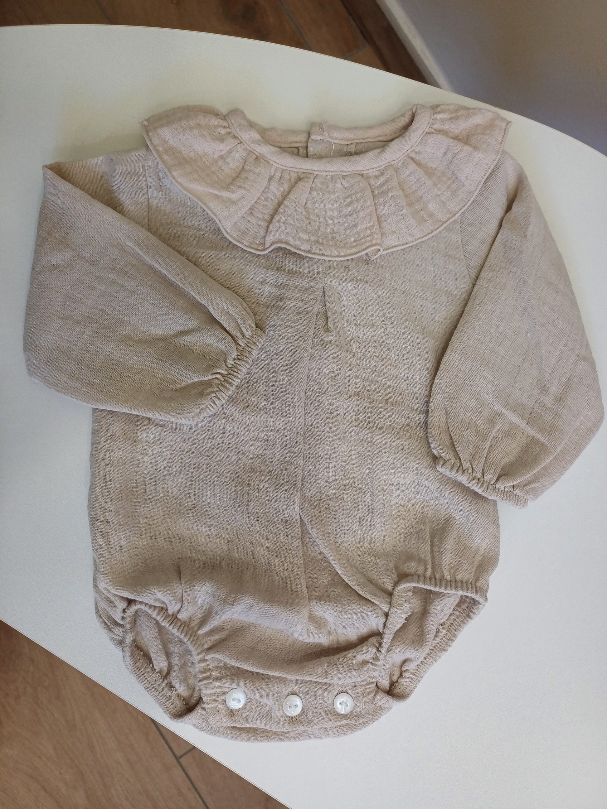 Body a manica lunga in morbida mussola di cotone, con collo arricciato a rouches per un tocco romantico. Chiusura con bottoncini in madreperla sul retro ed anche al cavallo. Leggero, traspirante e delicato sulla pelle, ideale per look eleganti e confortevoli.