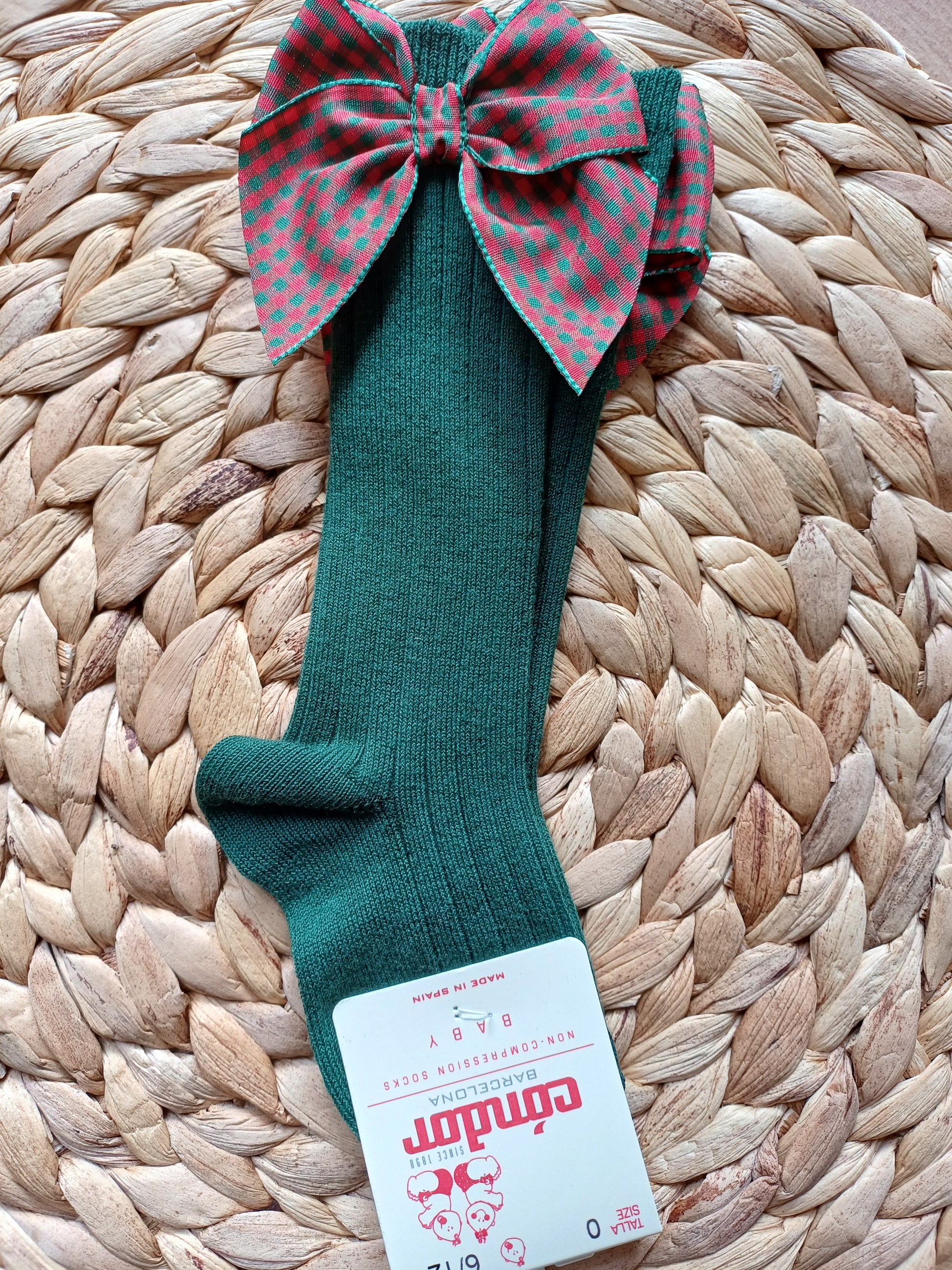 Calzino alto a coste in caldo cotone, impreziosito da un elegante fiocco rosso a quadretti verdi. Morbido, caldo e perfetto per un tocco natalizio raffinato.