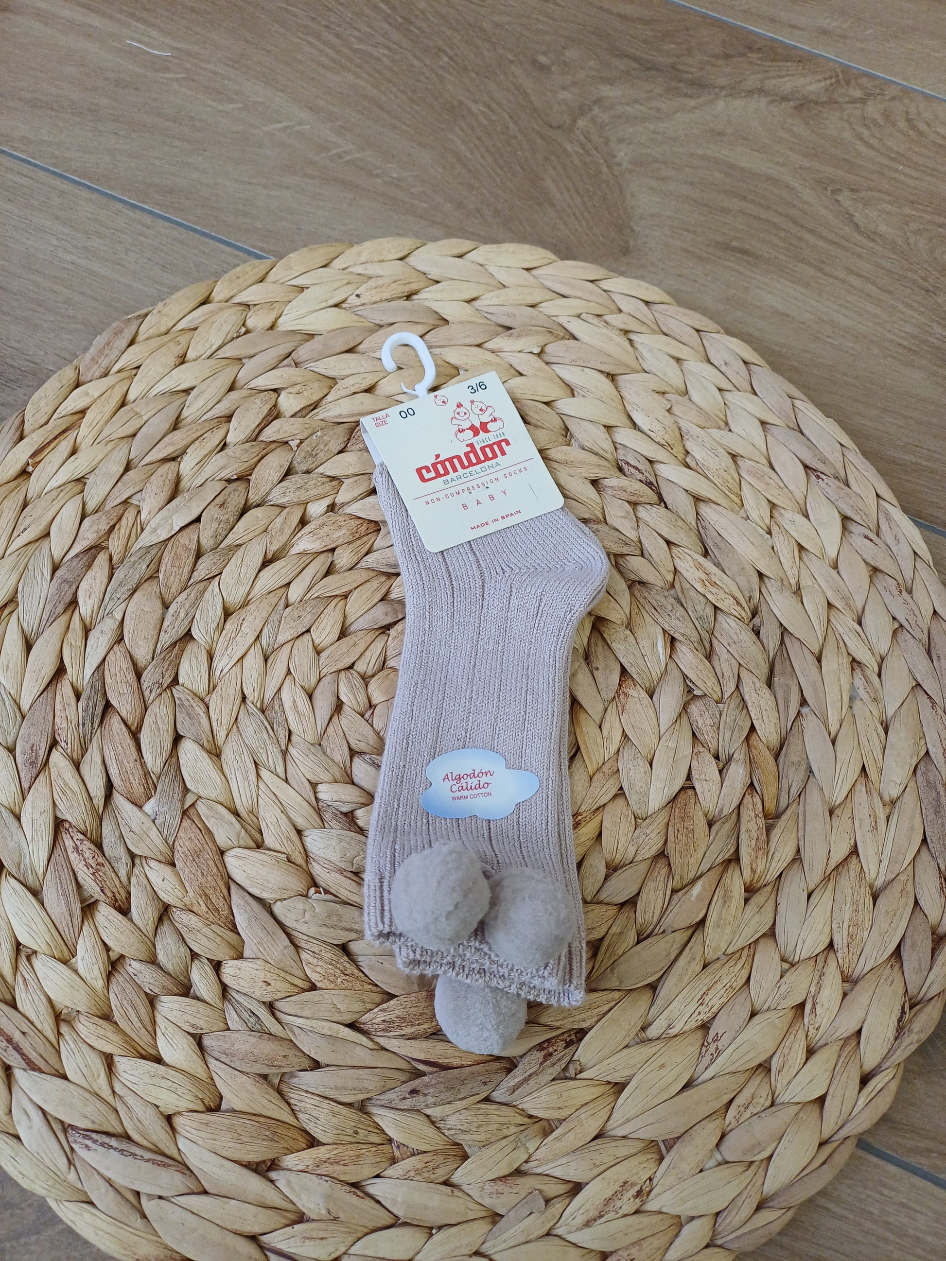 Calzino lungo color beige, morbido e delicato, impreziosito da piccoli pon pon applicati sui lati esterni. Confortevole e dolce nei dettagli, aggiunge un tocco tenero e raffinato, perfetto per completare outfit eleganti o cerimoniosi con un accento giocoso.
