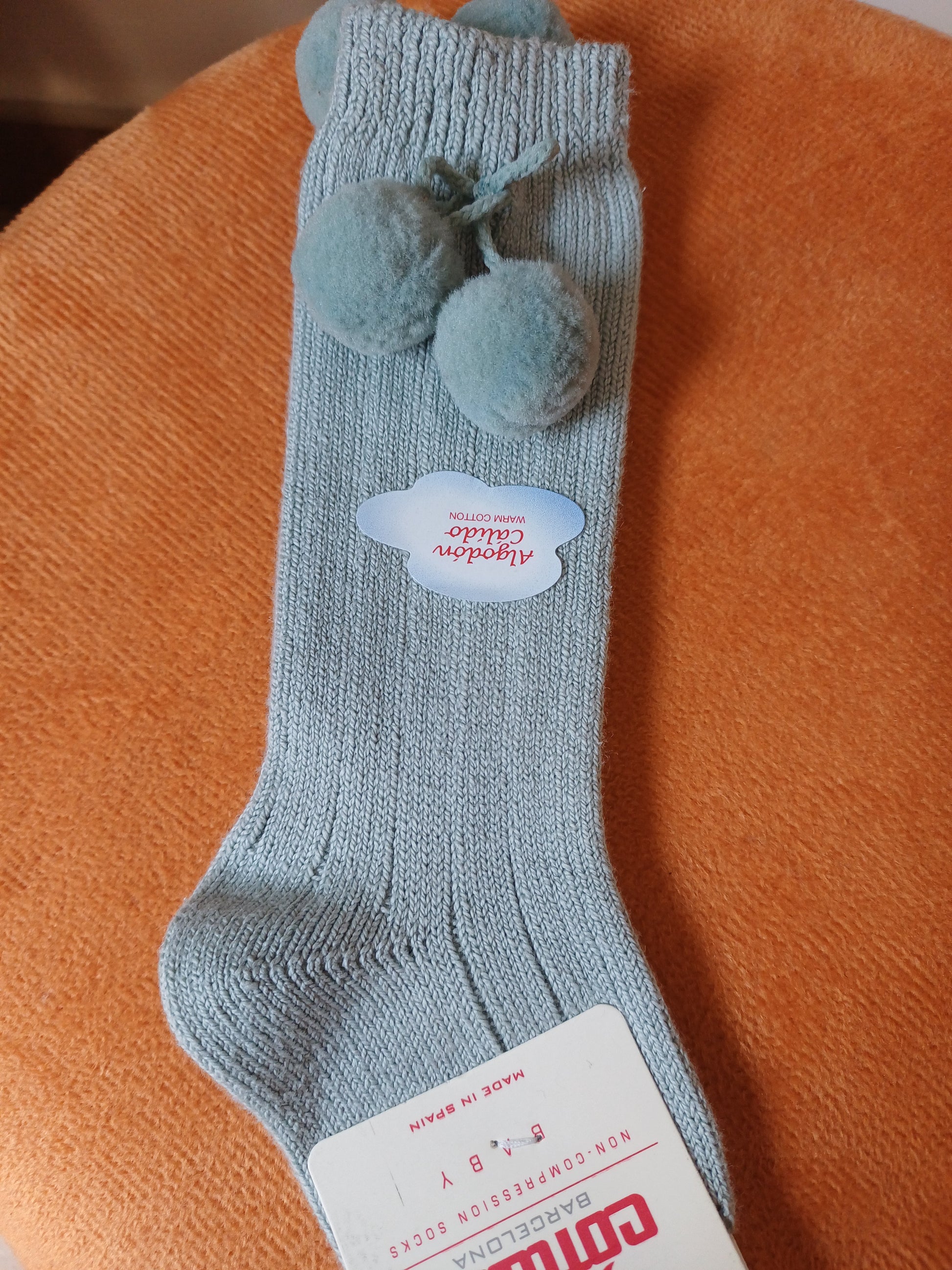 Calzino lungo color verde salvia, morbido e delicato, impreziosito da piccoli pon pon applicati sui lati esterni. Confortevole e dolce nei dettagli, aggiunge un tocco tenero e raffinato, perfetto per completare outfit eleganti o cerimoniosi con un accento giocoso.