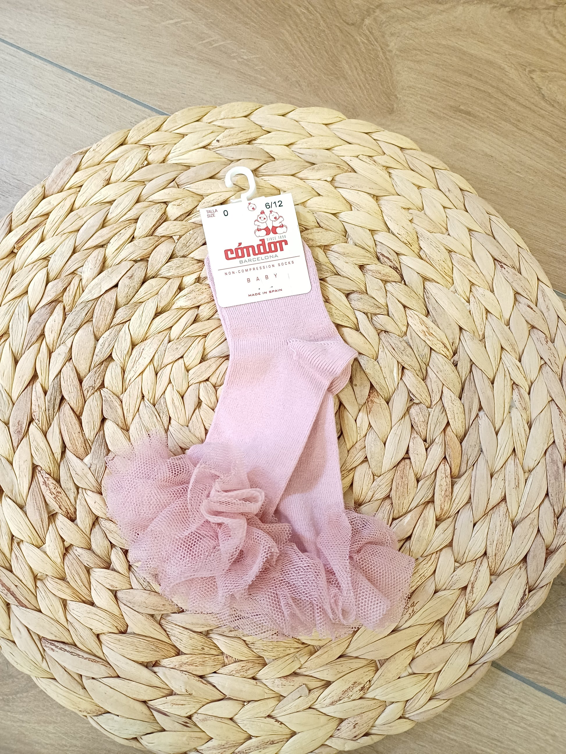 Calzino rosa con delicato volant in tulle sul bordo, leggero e vaporoso. Morbido e confortevole, dona un tocco romantico e raffinato al look, perfetto per occasioni speciali o outfit eleganti dal gusto dolce e sofisticato.