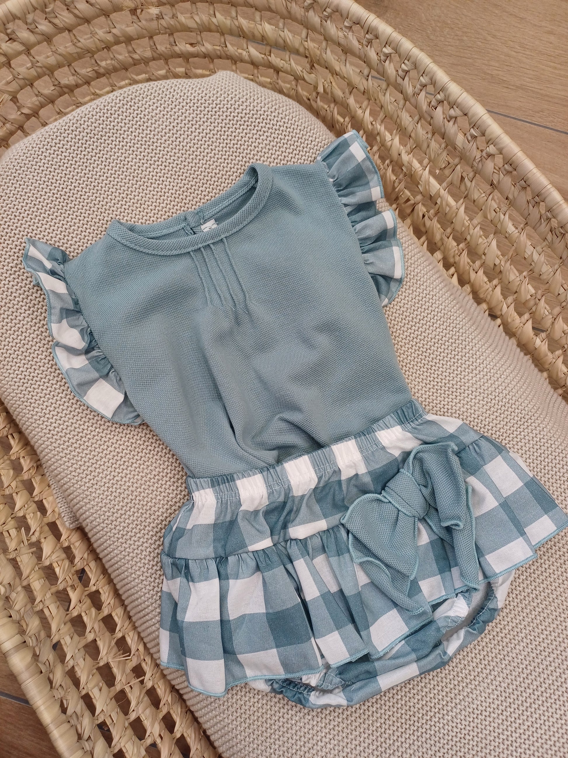 Completino con coulotte a quadri bianchi e petrolio, impreziosita da un fiocco tinta unita petrolio sul davanti. La magliettina a manica corta, in tono petrolio, presenta delicate rouches sulle maniche nella stessa fantasia a quadri, per un look armonioso, elegante e perfetto per l’estate.