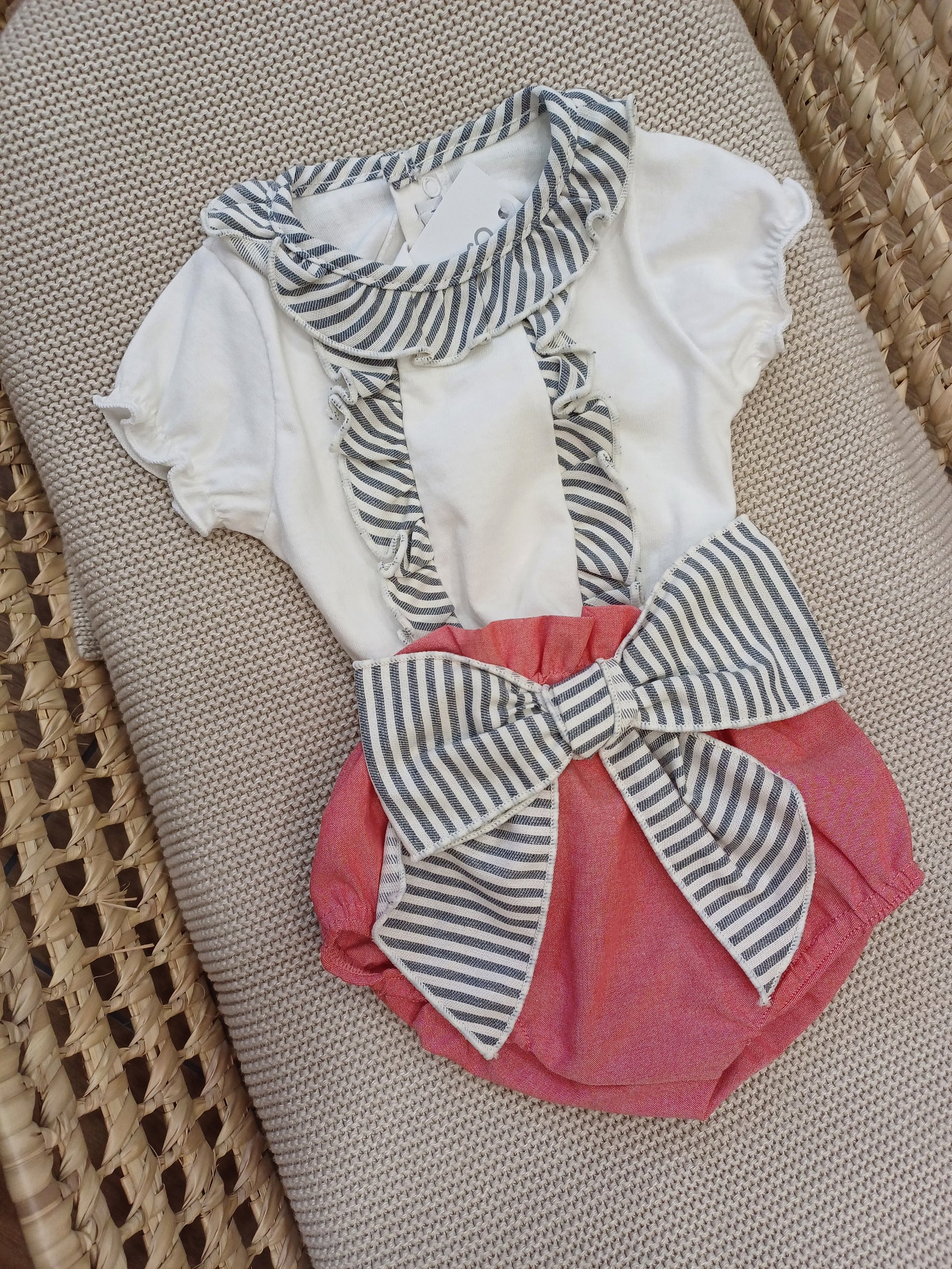 Completo bimba elegante con coulotte color corallo, arricchite da un grande fiocco centrale a righe bianche e grigie. La magliettina bianca presenta delicate rouches sul collo e un raffinato drappeggio frontale, realizzato nella stessa fantasia a righe del fiocco, creando un armonioso coordinato.