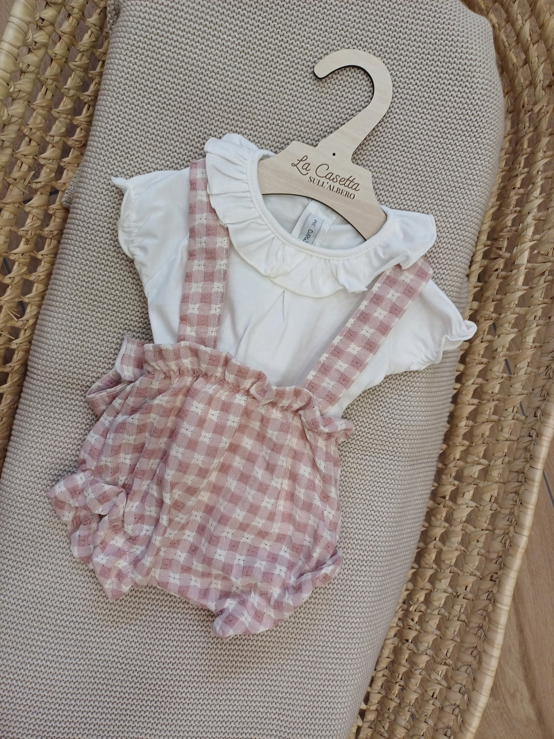 Completo elegante per bimba composto da una coulotte a quadretti con bretelle incrociate e un body bianco con rouches al collo. Realizzato in morbido cotone, unisce stile e comfort. Perfetto per occasioni speciali, dona un tocco retrò e raffinato all’outfit senza rinunciare alla praticità.