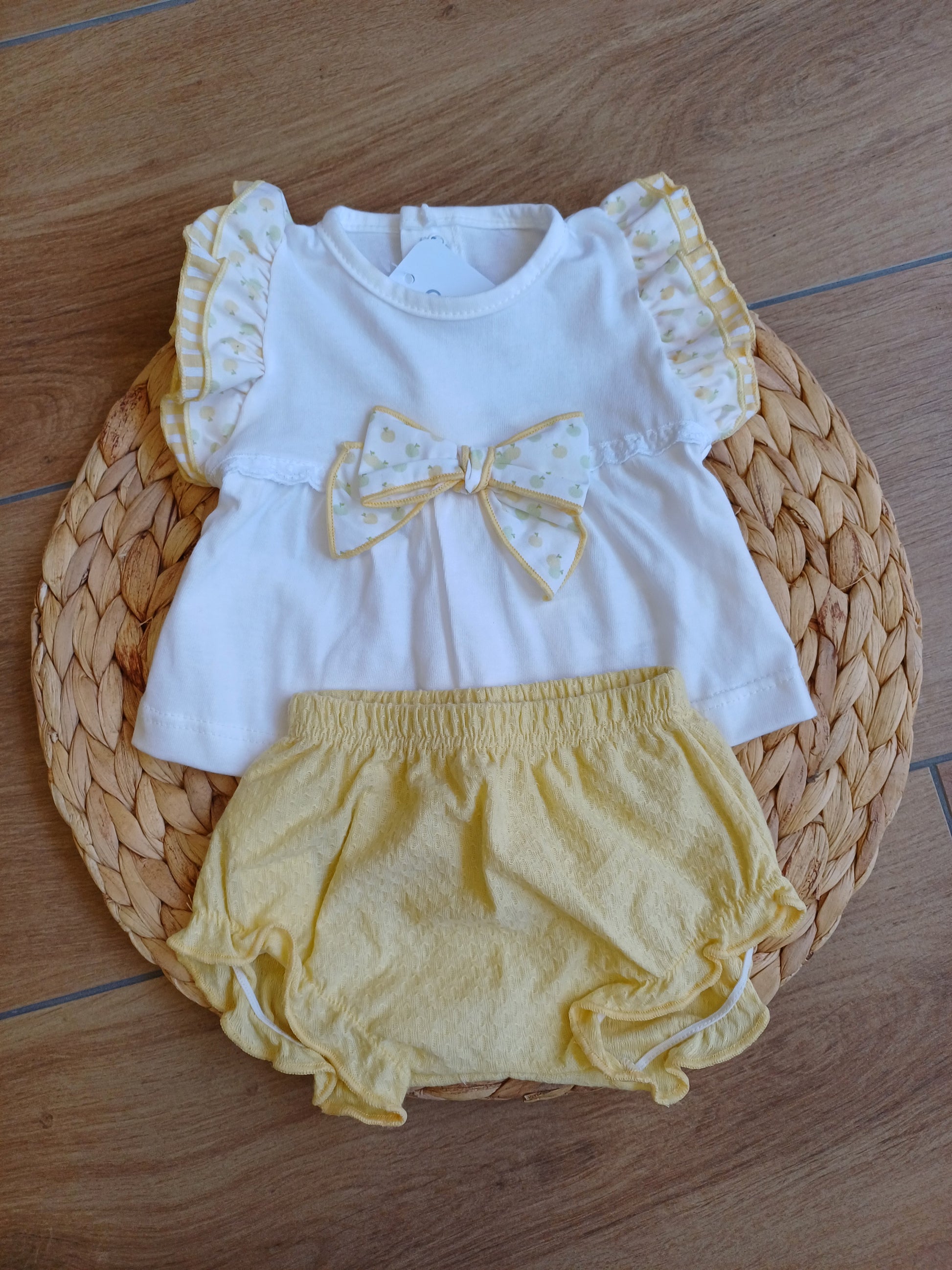Completino estivo composto da maglietta bianca con delicati dettagli gialli e un grazioso fiocco centrale sul davanti. Abbinata a coulotte gialla coordinata, è fresco, comodo e perfetto per le giornate di sole. Un look dolce e luminoso per un tocco di allegria quotidiana.