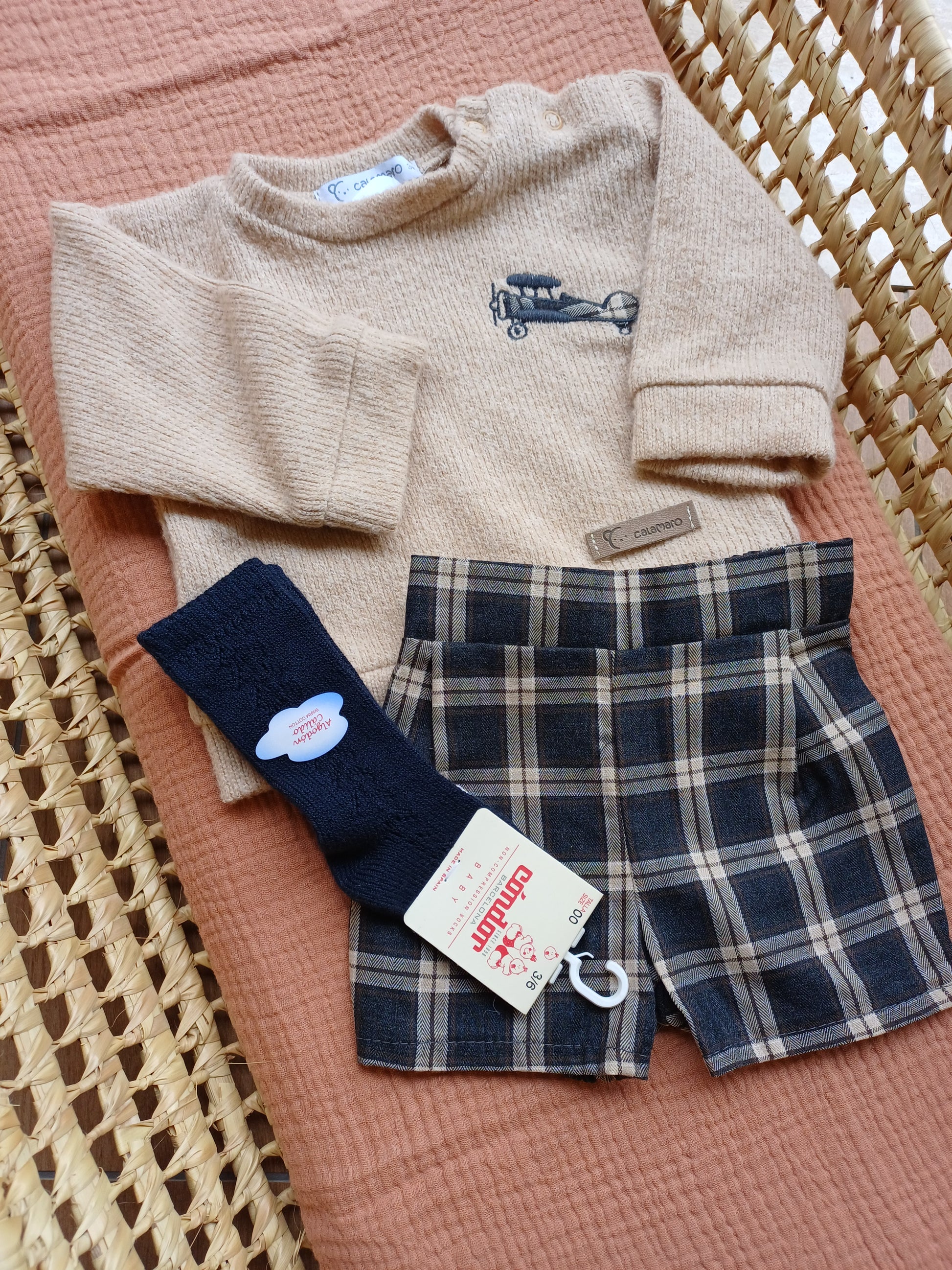 Delizioso completino bimbo due pezzi: maglioncino beige con dolce aeroplanino frontale, abbinato a pantaloncino scozzese nei toni caldi del marrone e beige. Morbido, elegante e confortevole, perfetto per un look raffinato ma giocoso nelle giornate autunnali.