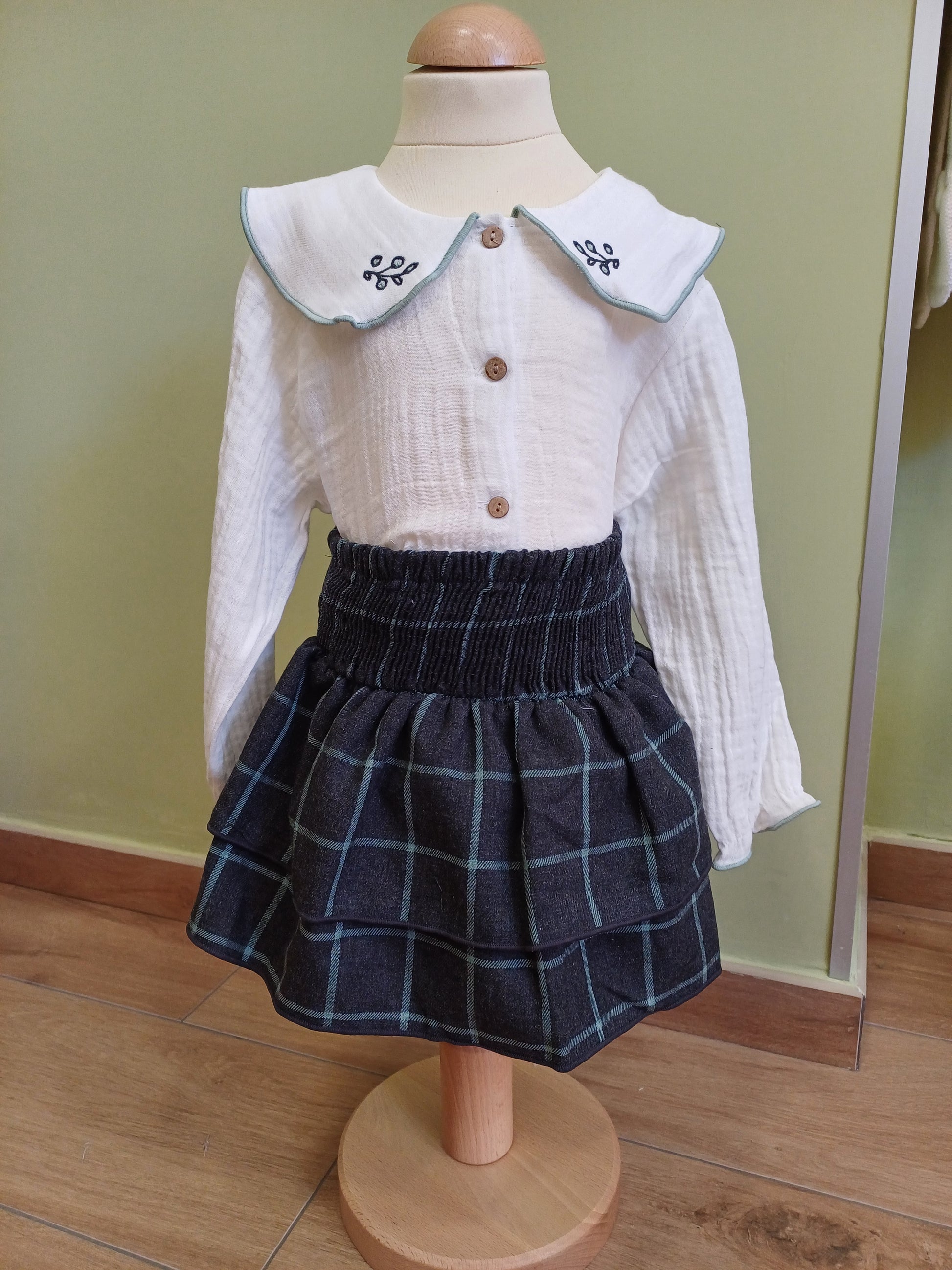 Completo bimba elegante con camicia a manica lunga in mussola bianca, colletto con bordura verde e decoro a foglie su entrambi i lati, chiusura con bottoncini in legno. Gonnellina a balze con elastico in vita, grigio scuro con grandi quadri formati da linee verde acqua. Raffinato e confortevole.