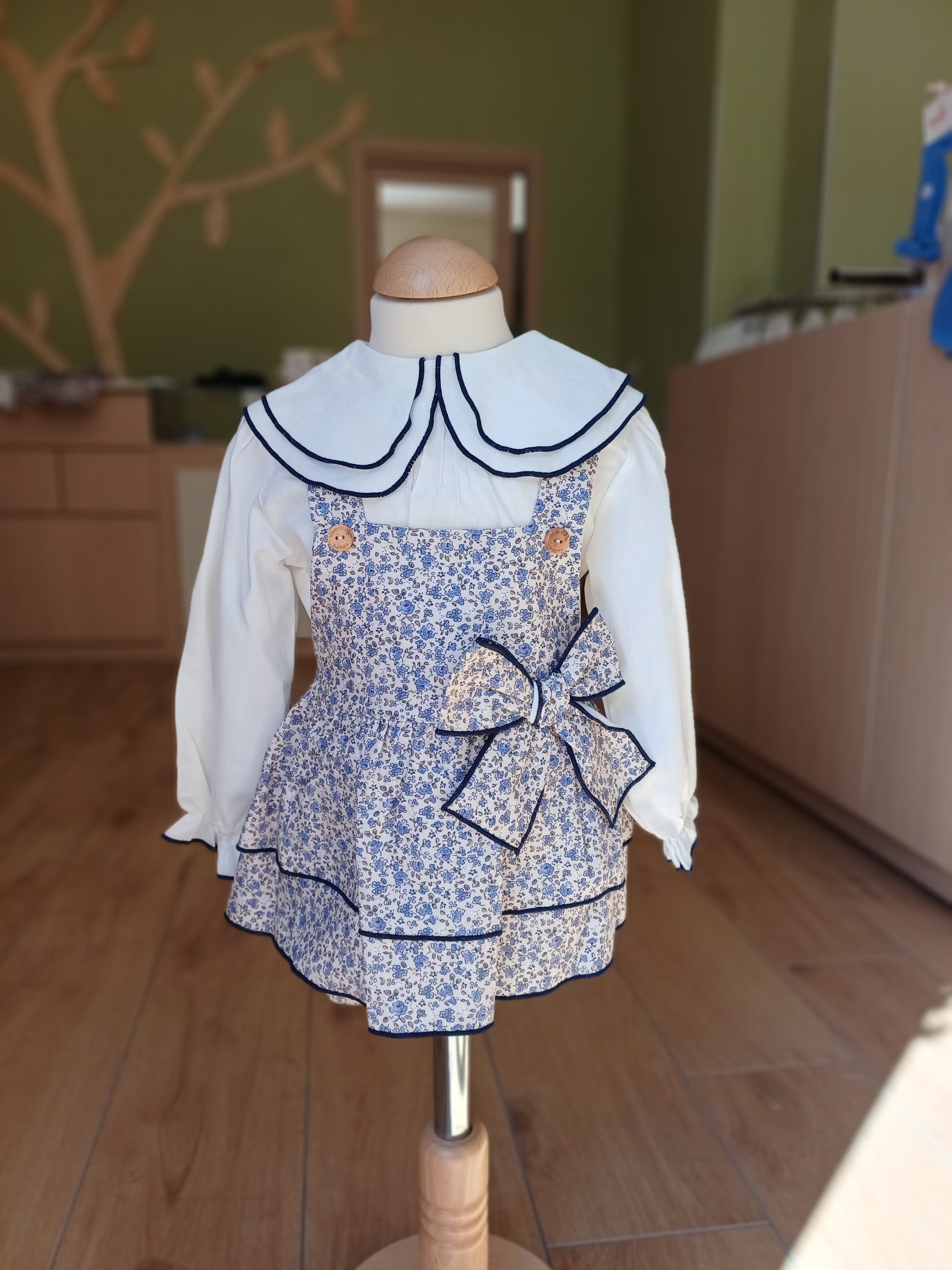 Completo bimba delicato con camicia bianca dal colletto rifinito con bordura blu e pagliaccetto in fantasia floreale sui toni del blu. Il look è impreziosito da un tenero fiocco frontale nella stessa fantasia. Romantico e raffinato, ideale per ogni occasione speciale.