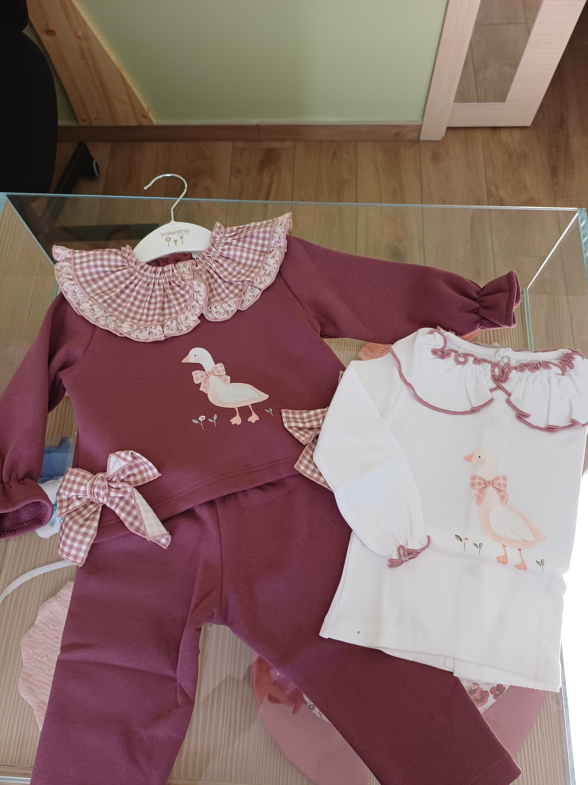 Completo bimba tre pezzi: maglietta felpata prugna con papera frontale, colletto a quadri rosa e bianchi, rouches floreali e due fiocchetti coordinati ai lati. Pantalone lungo felpato prugna abbinato. Maglietta bianca con stessa papera e colletto bianco bordato in rosa, dolce e raffinato.