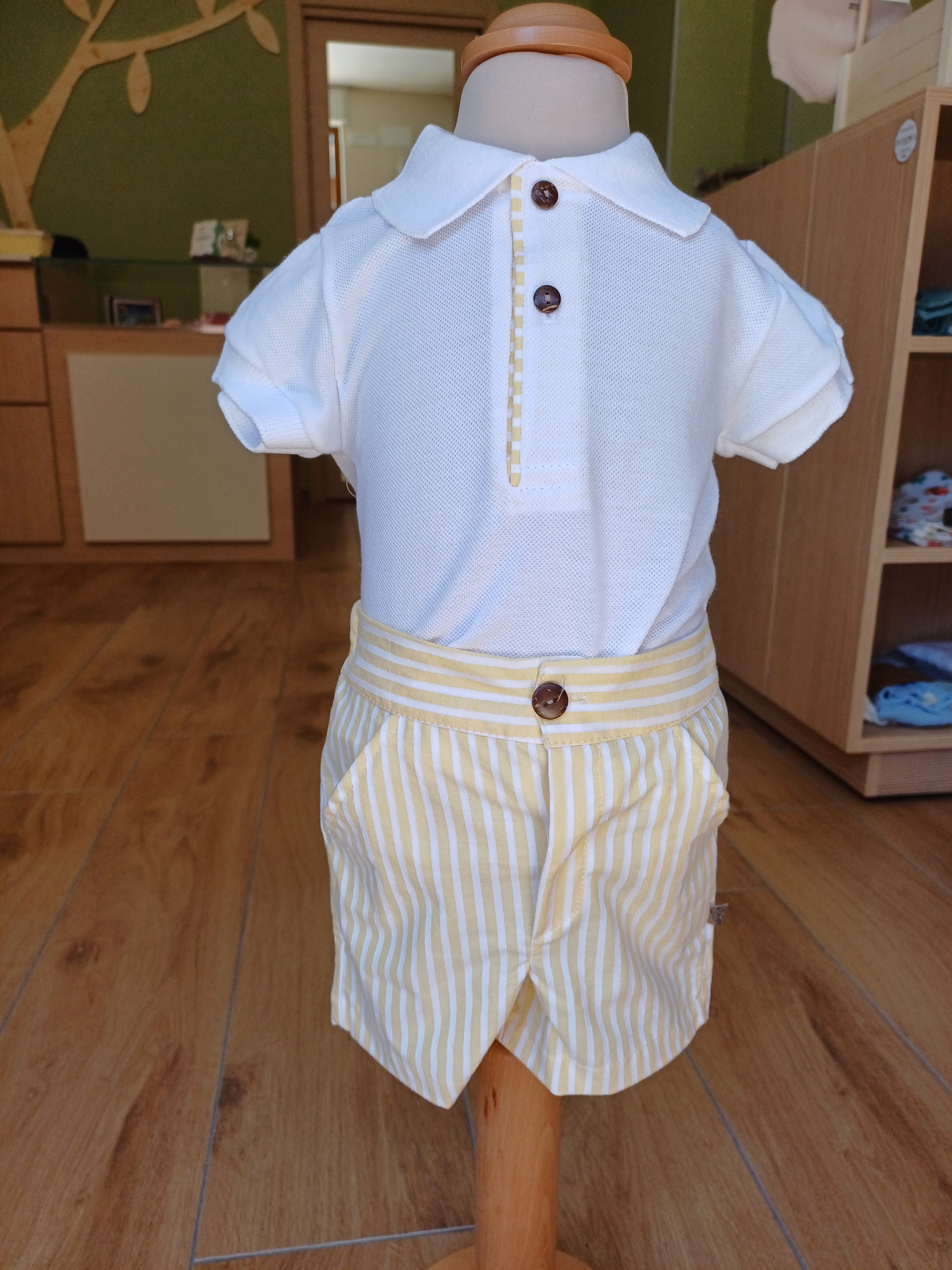 Completo bimbo in morbido cotone, perfetto per l’estate. Maglietta modello polo con due bottoni in legno, dal gusto naturale ed elegante. Abbinata a pantaloncino coordinato, comodo e pratico. Un look fresco e curato, ideale per ogni occasione, dallo stile casual ma con un tocco raffinato.