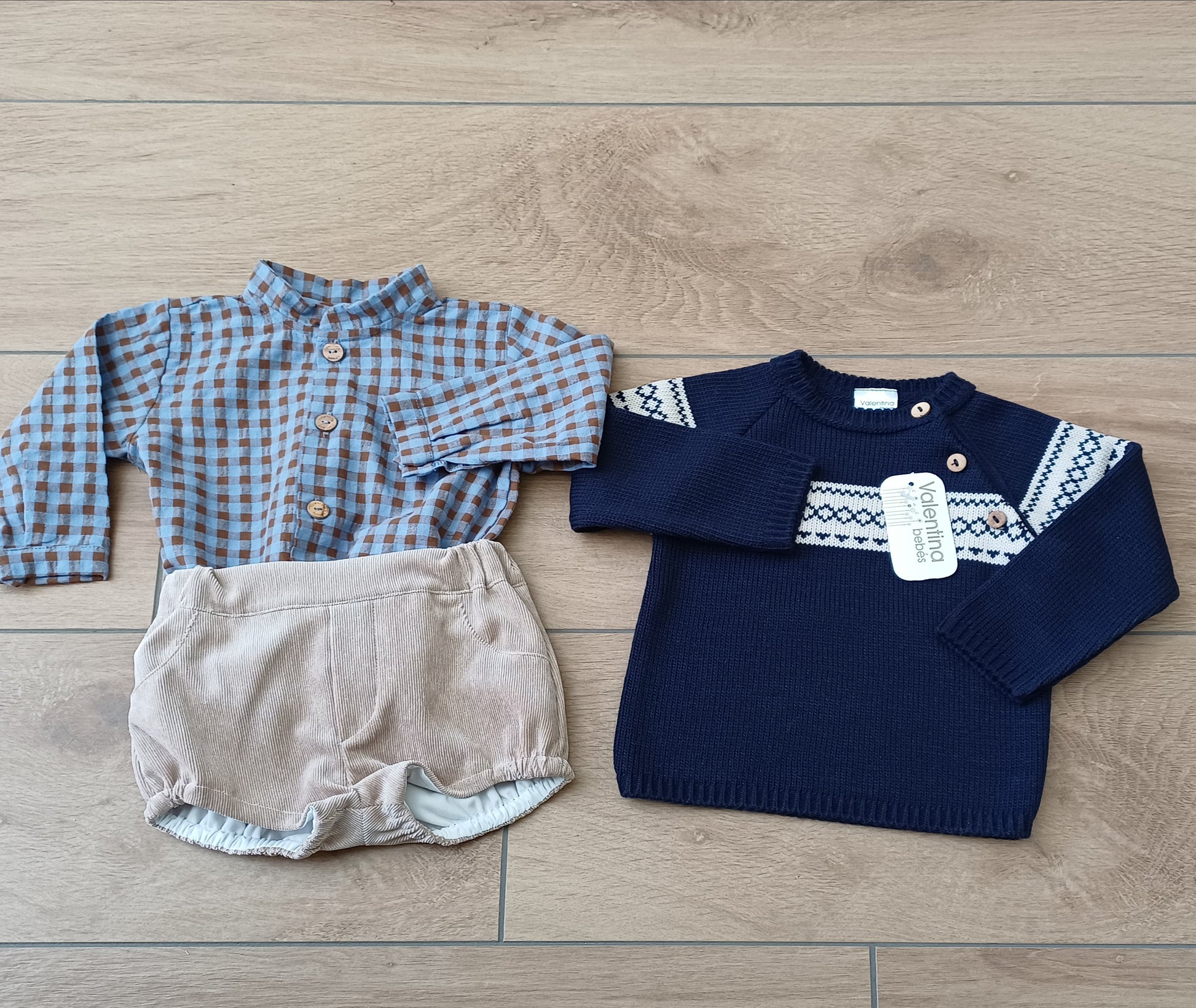 Completo bimbo tre pezzi: maglioncino blu con bottoncini in legno sul collo e striscia bianca frontale e posteriore, camicia a quadrettini marroncino e azzurri con bottoni in legno, e coulotte in morbido velluto beige. Un look elegante, caldo e raffinato per ogni occasione.