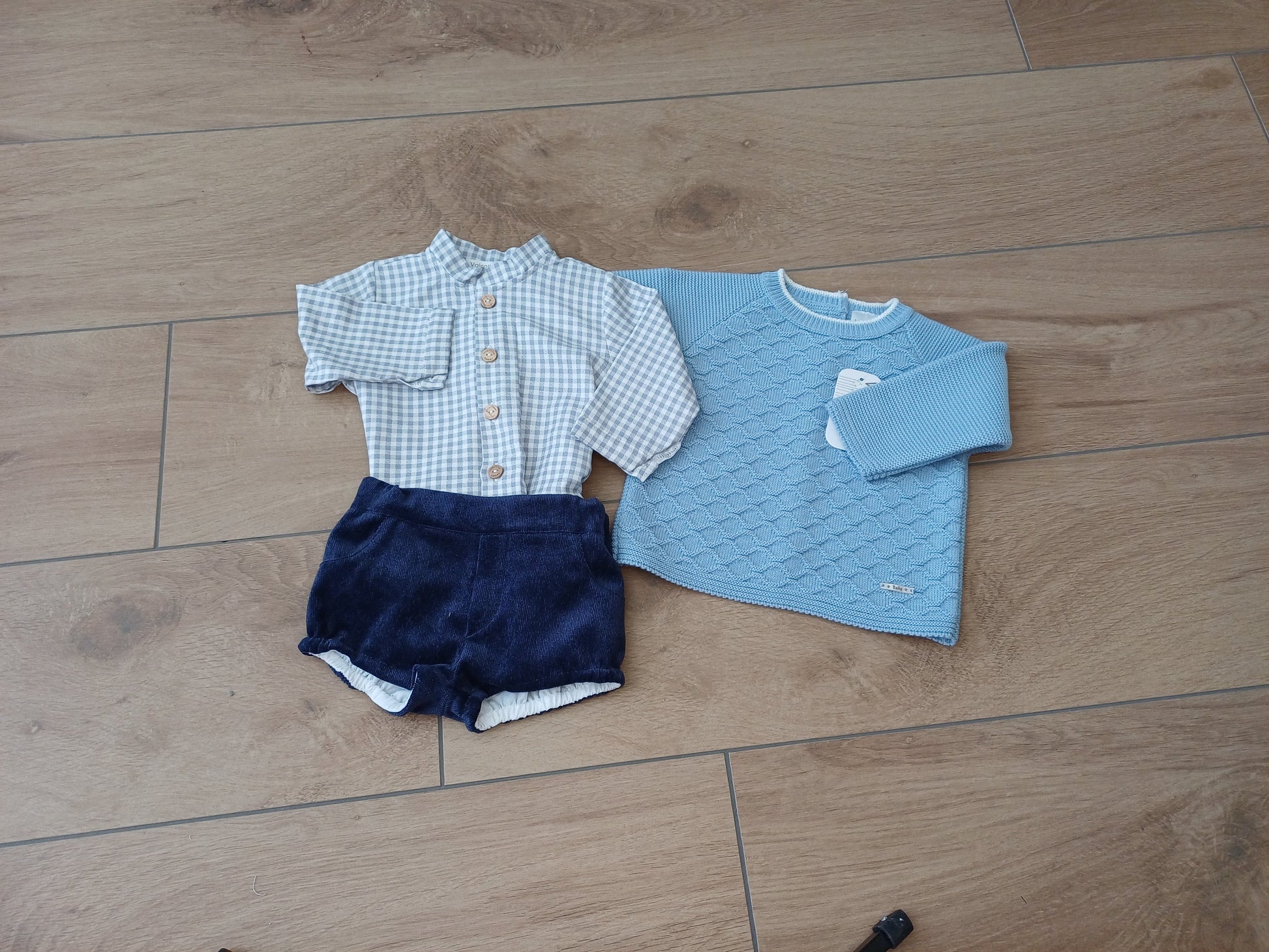Completo bimbo tre pezzi: maglioncino azzurro con chiusura sul retro, camicia a quadretti bianchi e grigi, e coulotte in morbido velluto blu. Un insieme elegante e confortevole, perfetto per le giornate più fresche e le occasioni speciali.