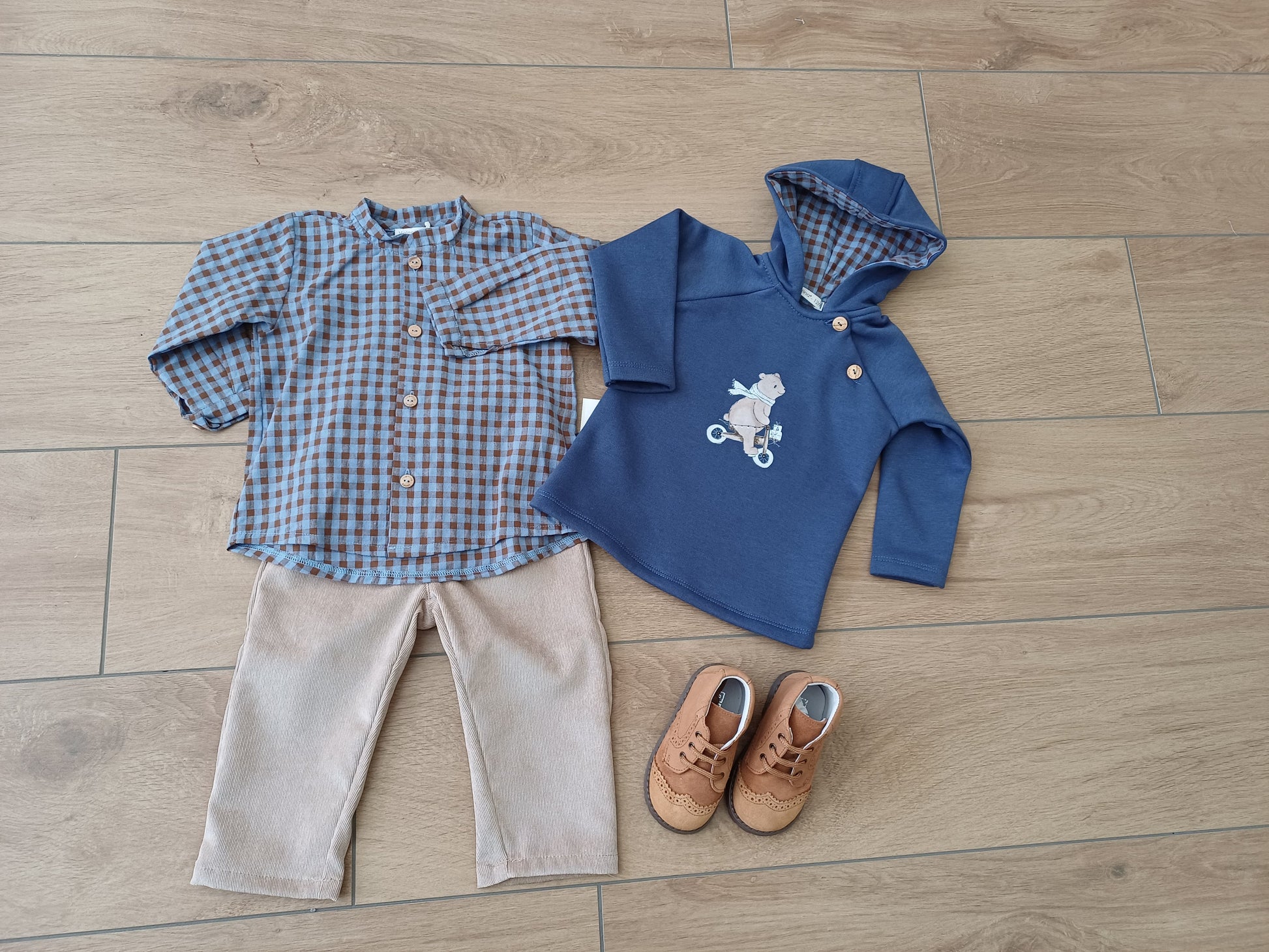 Completo bimbo tre pezzi: maglietta felpata blu con dolce orsetto in bicicletta sul davanti, cappuccio e due bottoncini in legno sul collo. Camicia a quadri marroncino e azzurro e pantalone lungo in velluto beige, per un look caldo, pratico e raffinato.