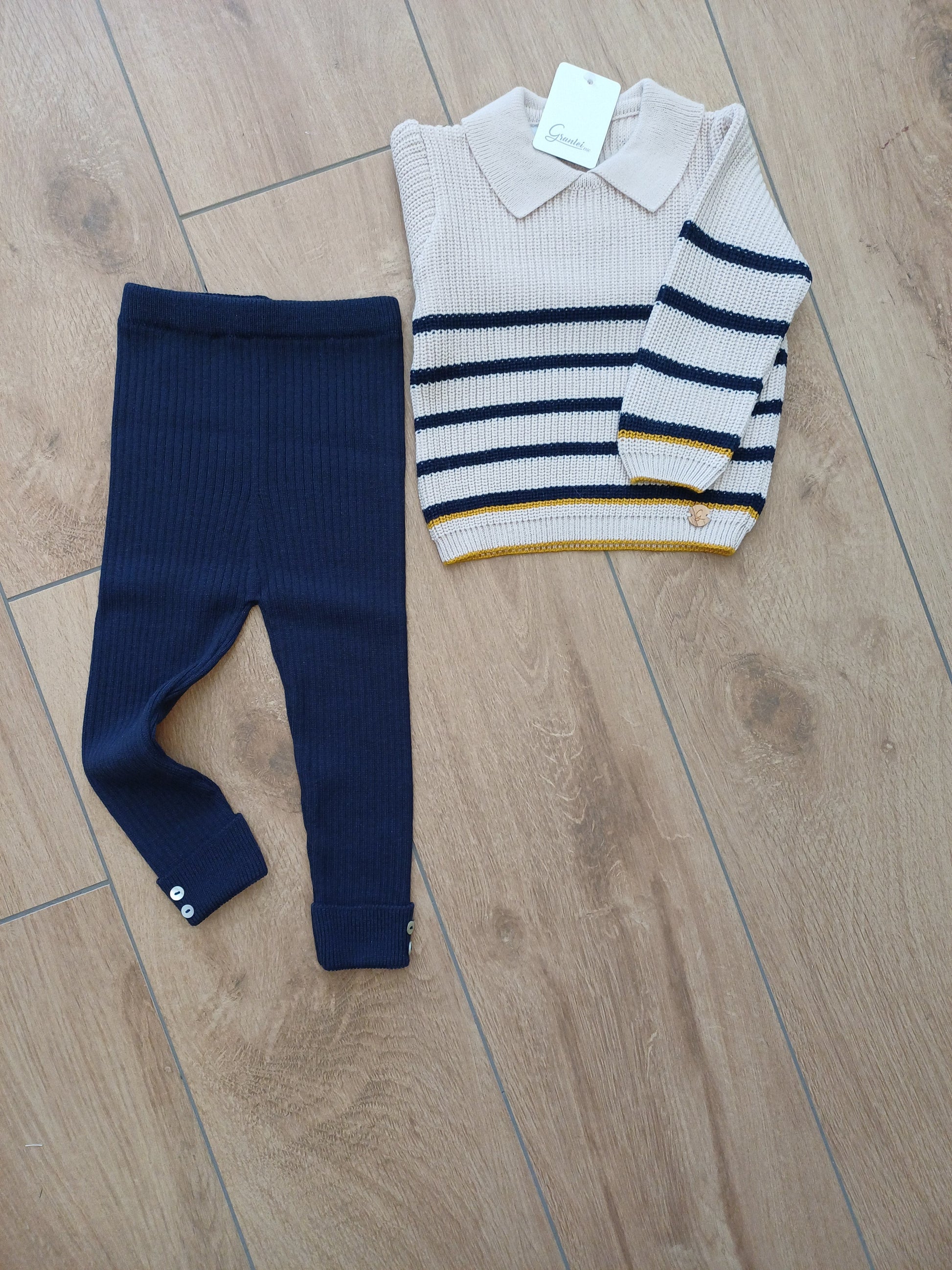 Completo bimbo due pezzi con maglioncino in caldo cotone beige a righe blu, morbido e confortevole. Leggings blu coordinati con risvolto al fondo e due piccoli bottoncini decorativi ai lati. Un look dolce e raffinato, perfetto per ogni occasione.