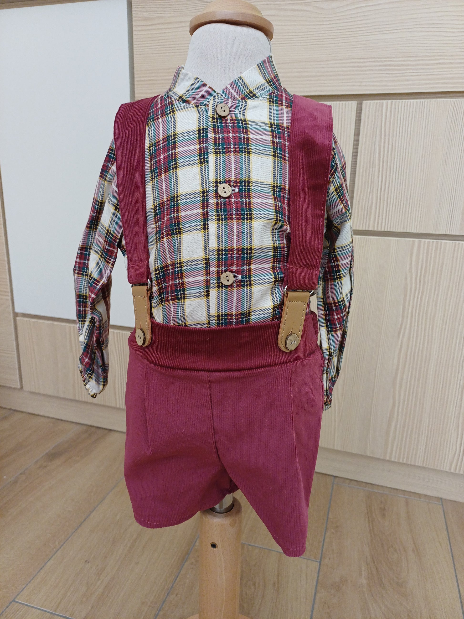 Completo bimbo elegante con camicia tartan a base bianca, righe bordeaux e verdi, impreziosita da bottoncini in legno. Abbinata a coulotte con bretelle in morbido velluto bordeaux, crea un look raffinato e caldo, perfetto per occasioni speciali o atmosfere natalizie.