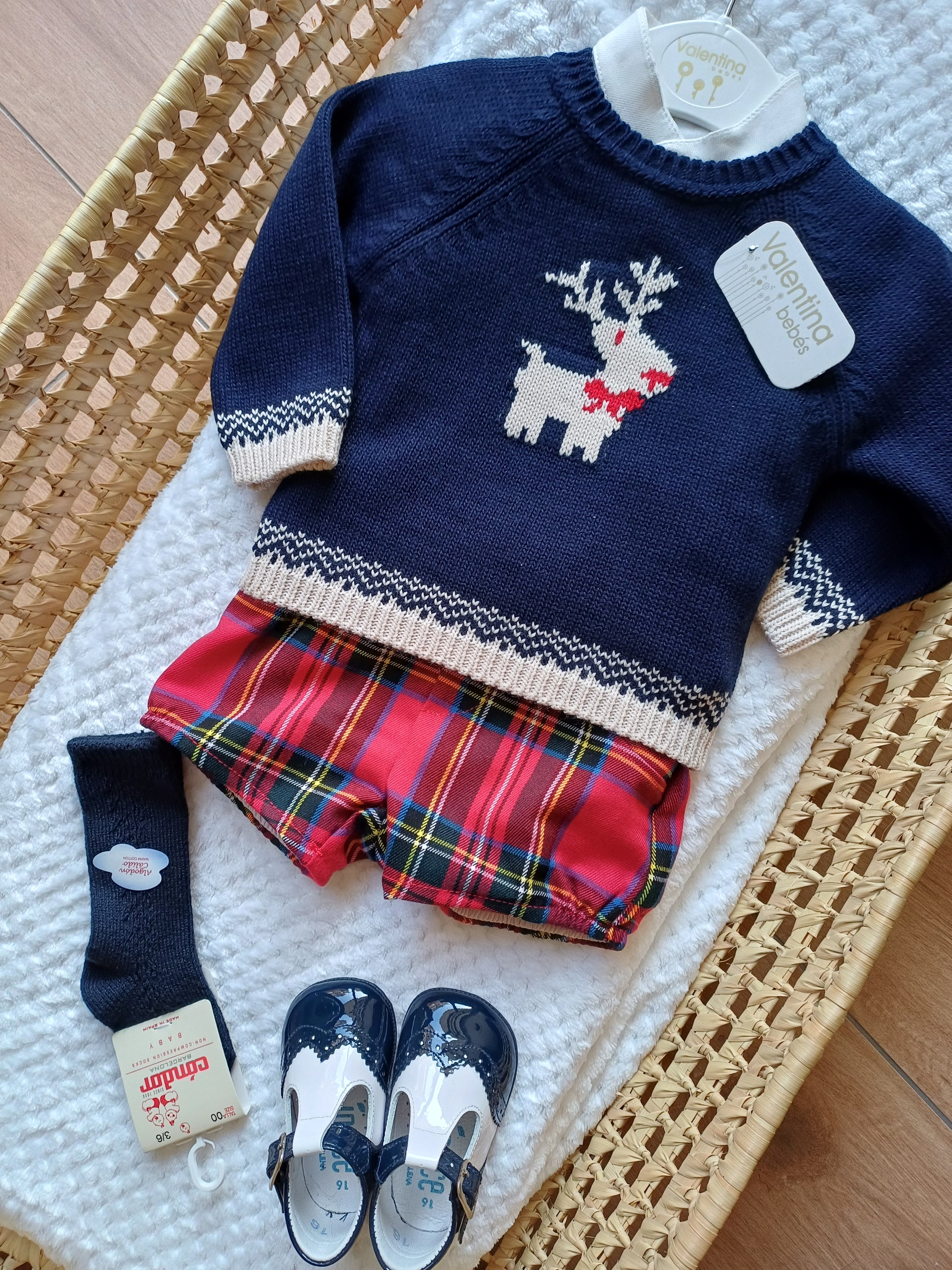 Completo bimbo tre pezzi composto da maglioncino blu con simpatica renna sul davanti, camicia bianca con raffinato collo alla coreana e pantaloncino in tartan. Un insieme caldo e curato, ideale per le feste e le giornate speciali.