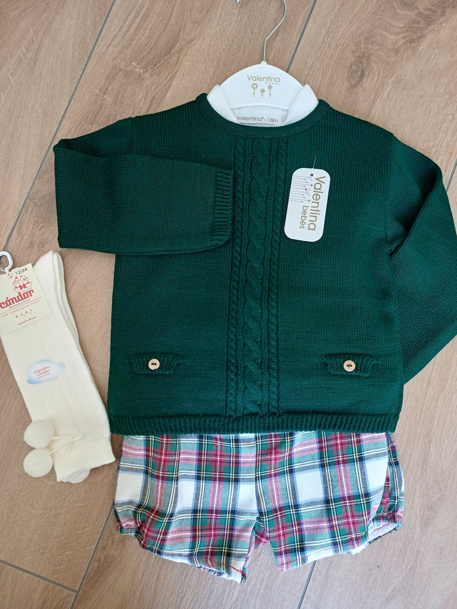 Completo bimbo tre pezzi con maglioncino verde lavorato a intreccio sul davanti, due bottoncini decorativi e finte taschine. Abbinato a camicia bianca con collo alla coreana e pantaloncino in tartan su fondo bianco. Elegante e confortevole, perfetto per le occasioni speciali.