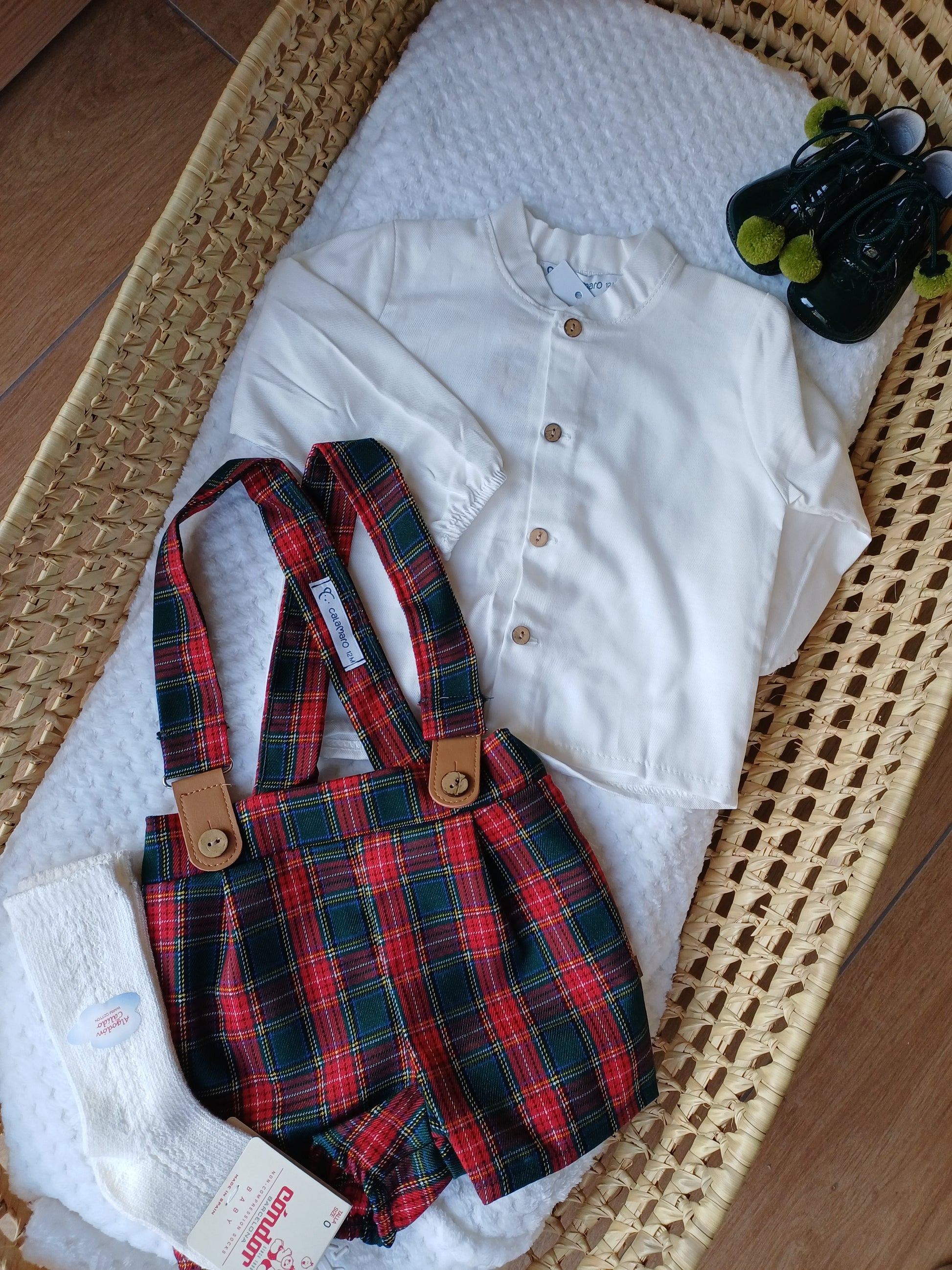 Completo bimbo elegante e raffinato: camicia bianca in cotone con collo alla coreana e delicati bottoncini in legno, abbinata a pantaloncino con bretelle regolabili in tessuto tartan. Perfetto per cerimonie o occasioni speciali, unisce stile classico e comfort naturale.