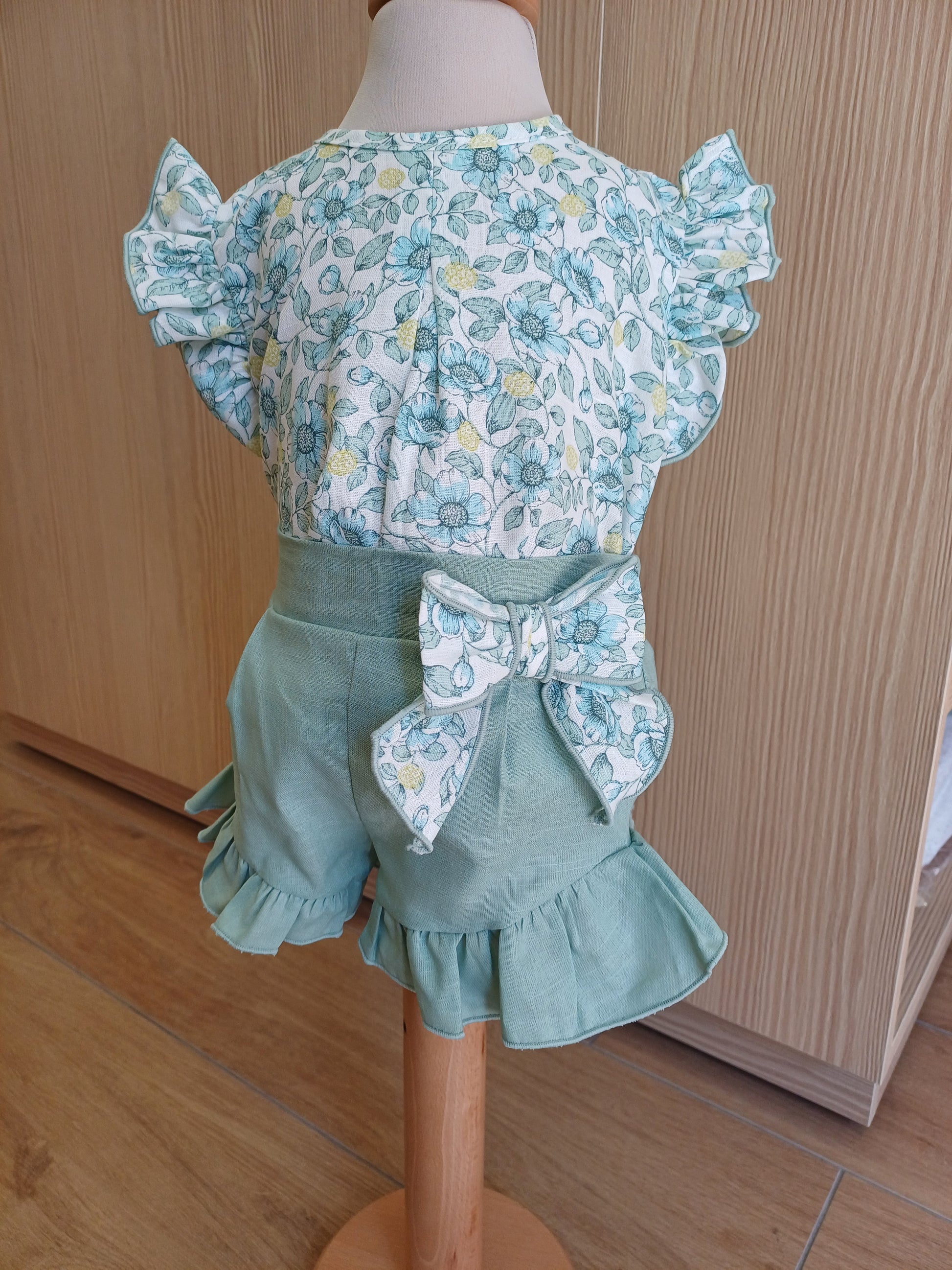 Completo cerimonia bimba elegante e delicato. Blusa in fantasia floreale sui toni del verde salvia, con manichina drappeggiata e chiusura posteriore con bottoncini. Abbinato a pantaloncino salvia con fiocco laterale sinistro in tessuto coordinato alla blusa. Raffinato e fresco, perfetto per eventi speciali con stile naturale.