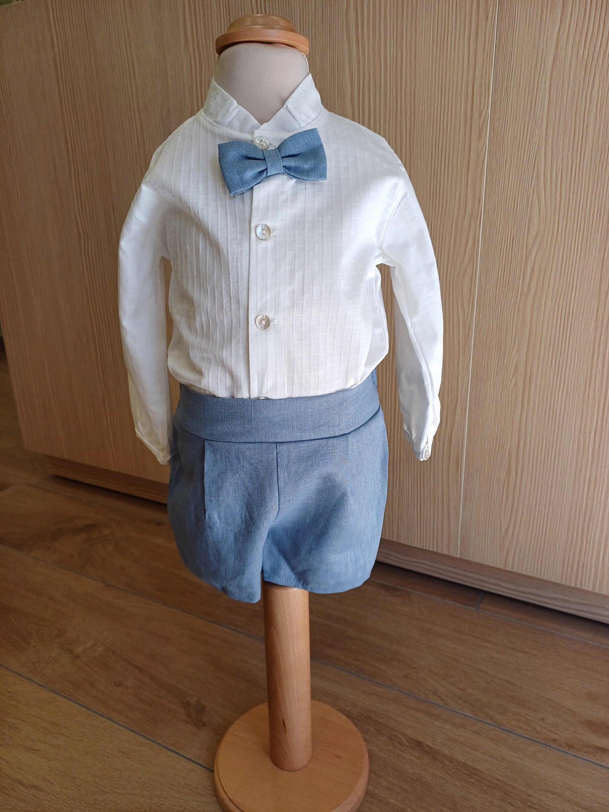 Elegante completo da cerimonia per bimbo in puro lino, perfetto per eventi speciali. Composto da pantalone corto e camicia a maniche lunghe coordinata, unisce stile e comfort grazie al tessuto leggero e traspirante. Il design raffinato e i dettagli curati rendono questo outfit ideale per matrimoni, battesimi e altre occasioni importanti.