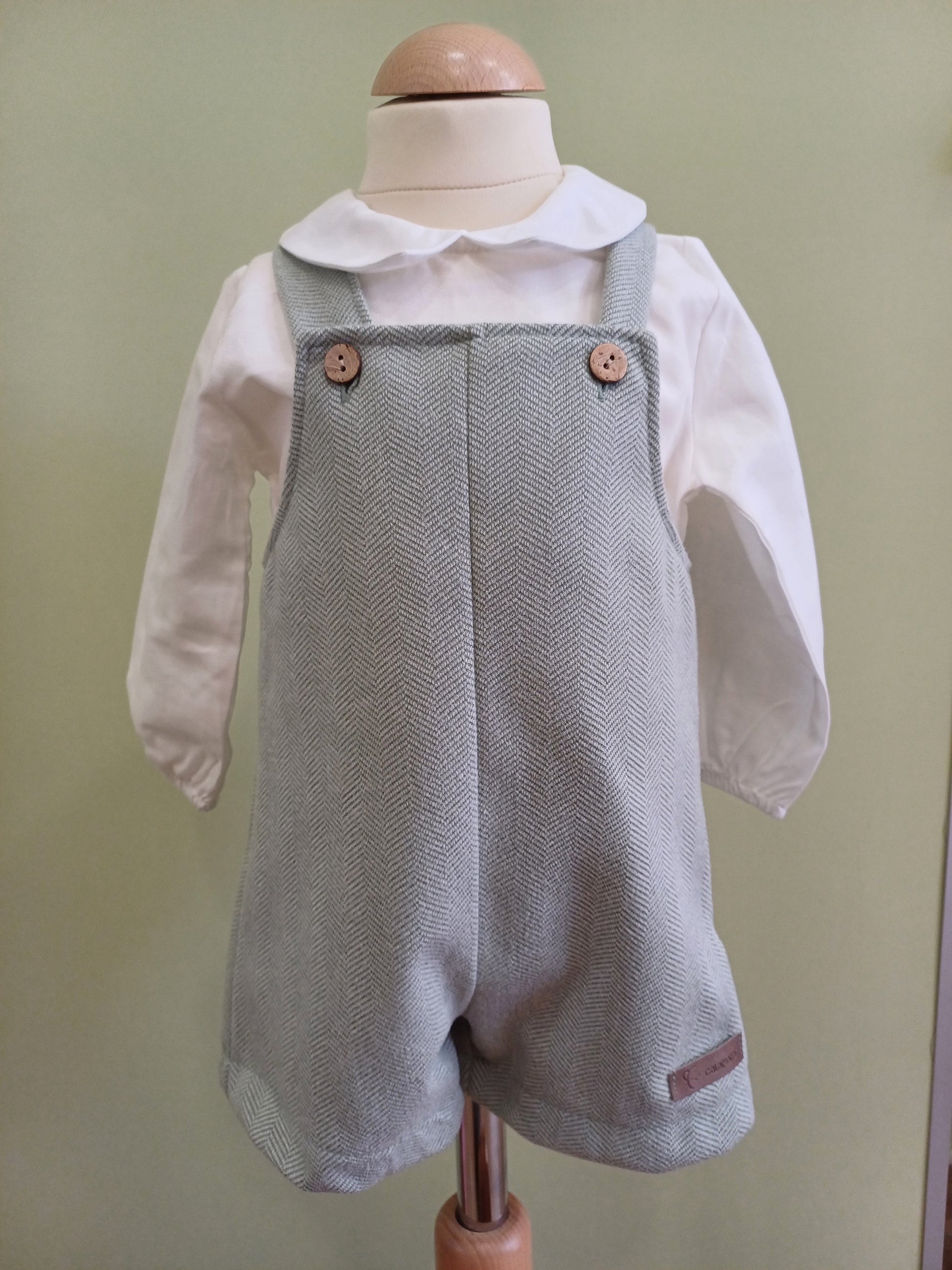 Elegante completo cerimonia bimbo composto da camicina bianca a manica lunga con colletto classico e salopette verde in flanella leggera. Chiusura frontale con bottoncini in legno per un tocco naturale. Raffinato e confortevole, ideale per occasioni speciali con uno stile dolce e curato.
