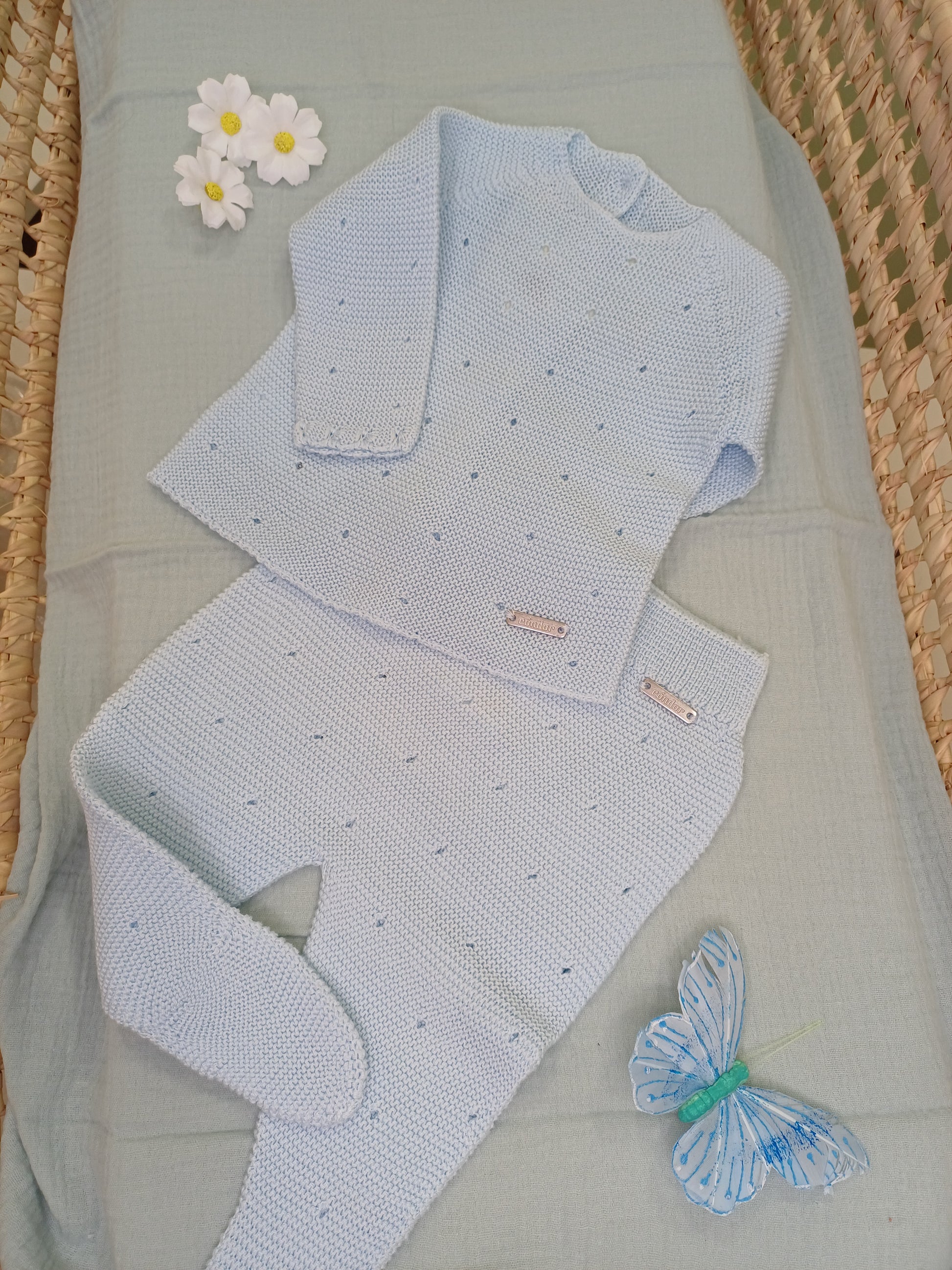 Tutina due pezzi in filo di cotone azzurro, ideale per l’uscita clinica. Composta da maglia a manica lunga e pantaloncino coordinato, assicura comfort e delicatezza sulla pelle. Chiusura posteriore con bottoncini tono su tono per una vestibilità pratica ed elegante. Perfetta per un primo look speciale.