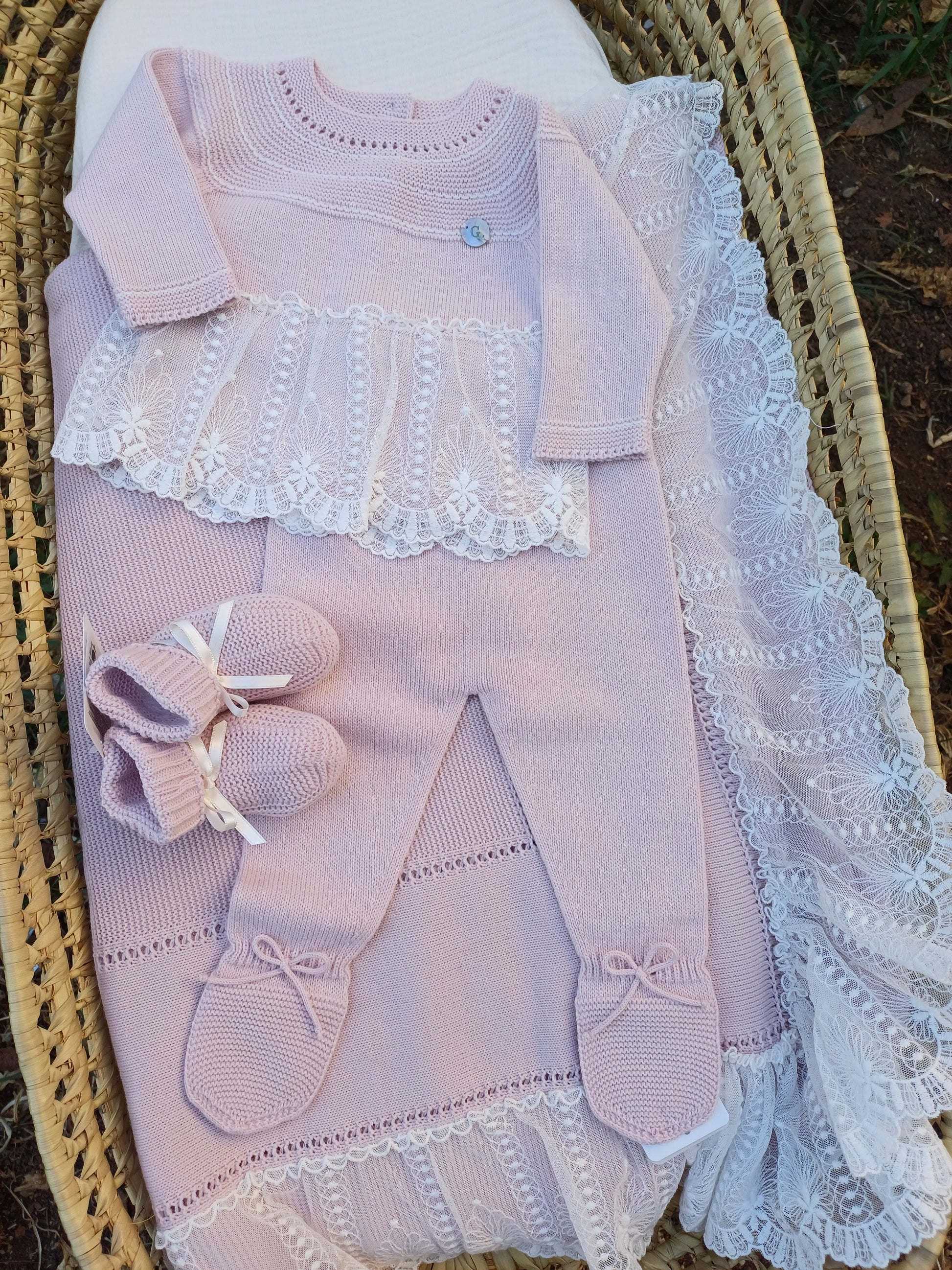 Morbida coperta in caldo cotone rosa, ideale per l’uscita dalla clinica. Bordo interamente decorato con delicato pizzo bianco, che aggiunge un tocco elegante e raffinato. Calda, confortevole e dolce, perfetta per avvolgere la bimba nei primi momenti fuori casa.