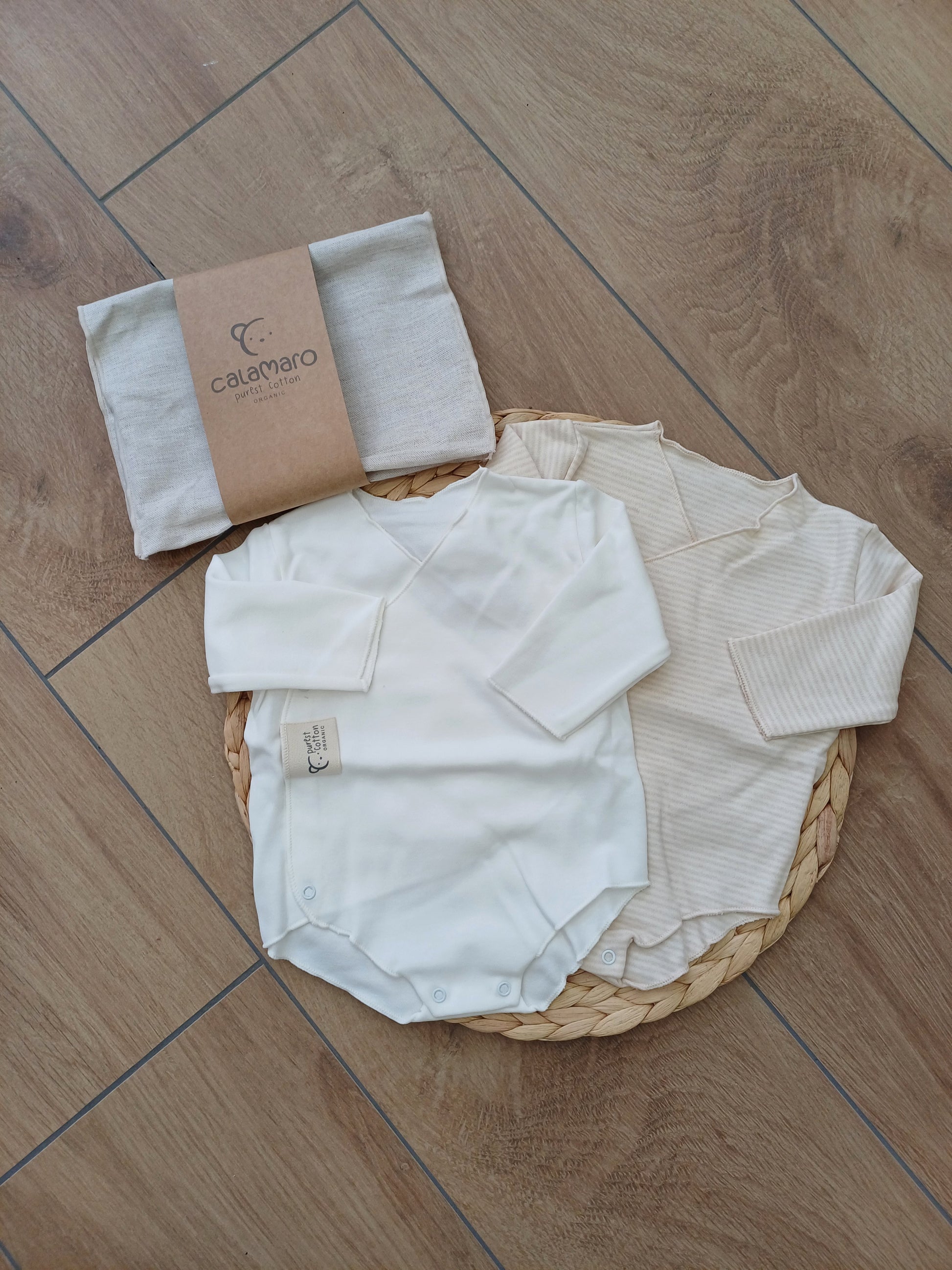 Coppia di body a manica lunga in cotone biologico: uno bianco essenziale, l’altro a righe beige dal gusto delicato. Morbidi sulla pelle, ideali per ogni stagione. Pratici, sostenibili e perfetti per un look naturale e confortevole.