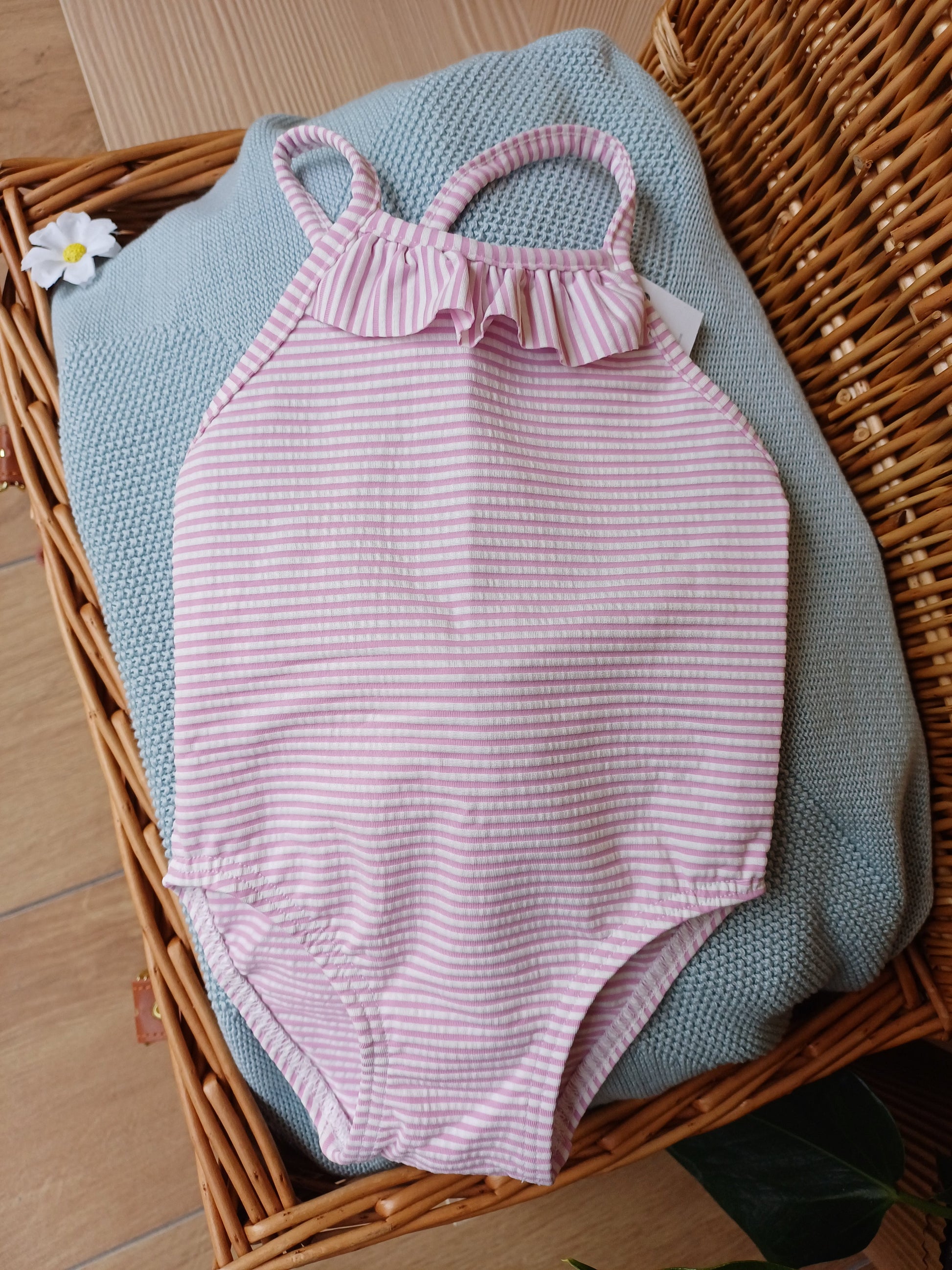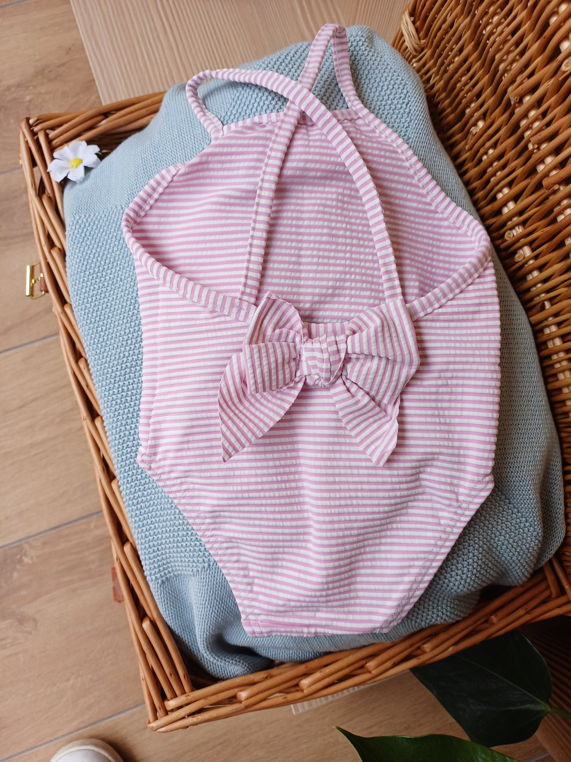 Costume intero da bimba in tessuto elasticizzato, tinta unita o fantasia delicata. Spalline sottili incrociate sulla schiena e grande fiocco decorativo dietro. Taglio comodo e sicuro, ideale per il mare o la piscina. Look dolce e raffinato, perfetto per piccole sirenette.