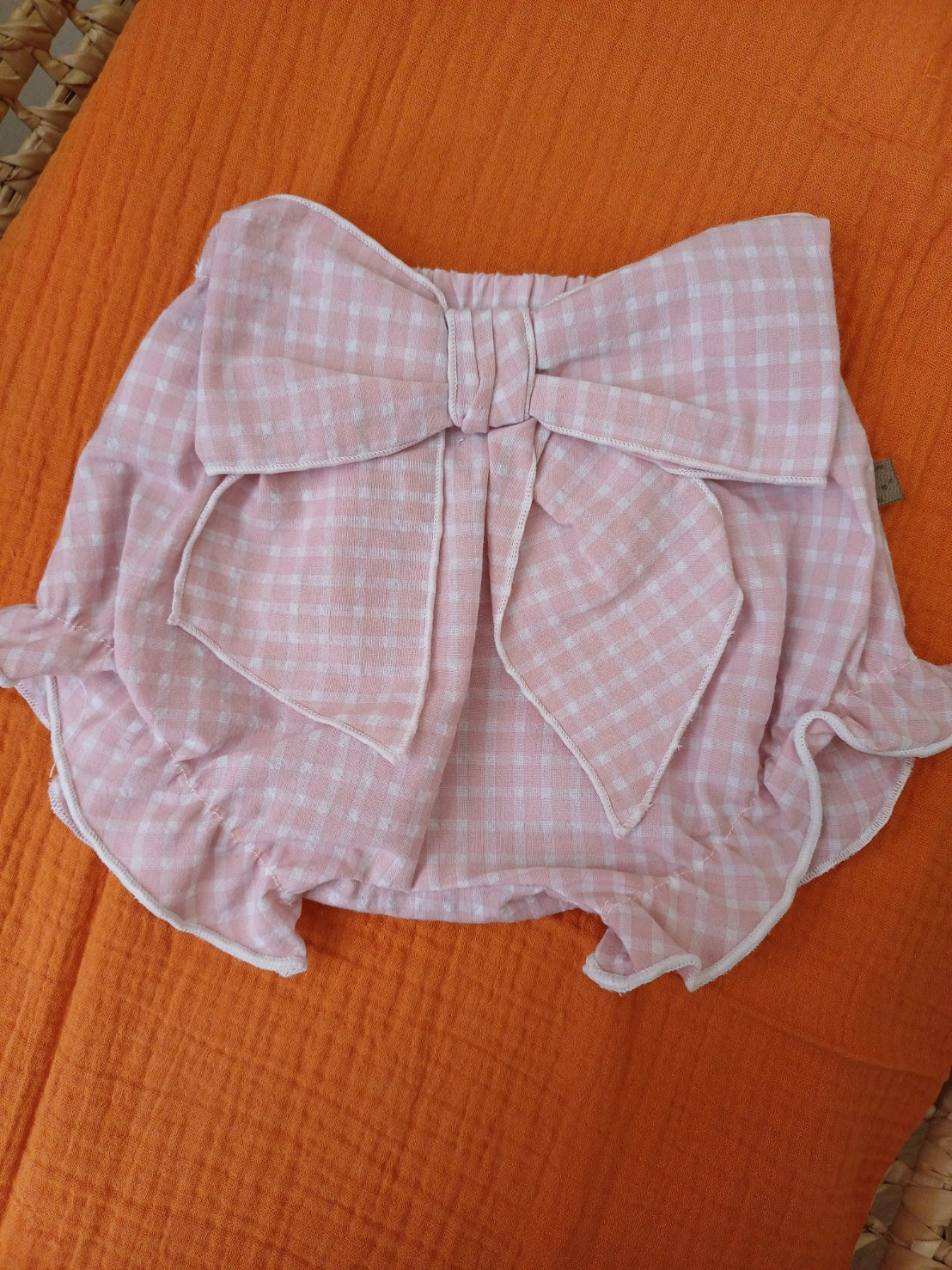 Culotte in morbido cotone con delicata fantasia a quadrettini bianchi e rosa. Comoda e leggera, è impreziosita da un fiocco frontale nella stessa fantasia, per un tocco dolce e curato. Perfetta da abbinare a bluse o vestitini, ideale per look estivi freschi e romantici.