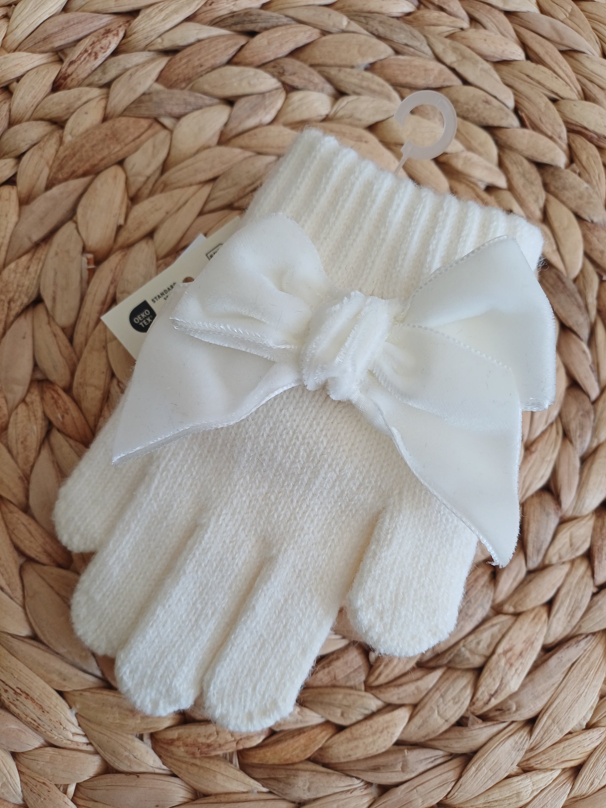 Delicati guanti in caldo cotone bianco, impreziositi da un elegante fiocco in velluto tono su tono sul dorso di entrambe le mani. Morbidi e raffinati, offrono calore e stile, perfetti per completare con eleganza gli outfit delle giornate più fredde.