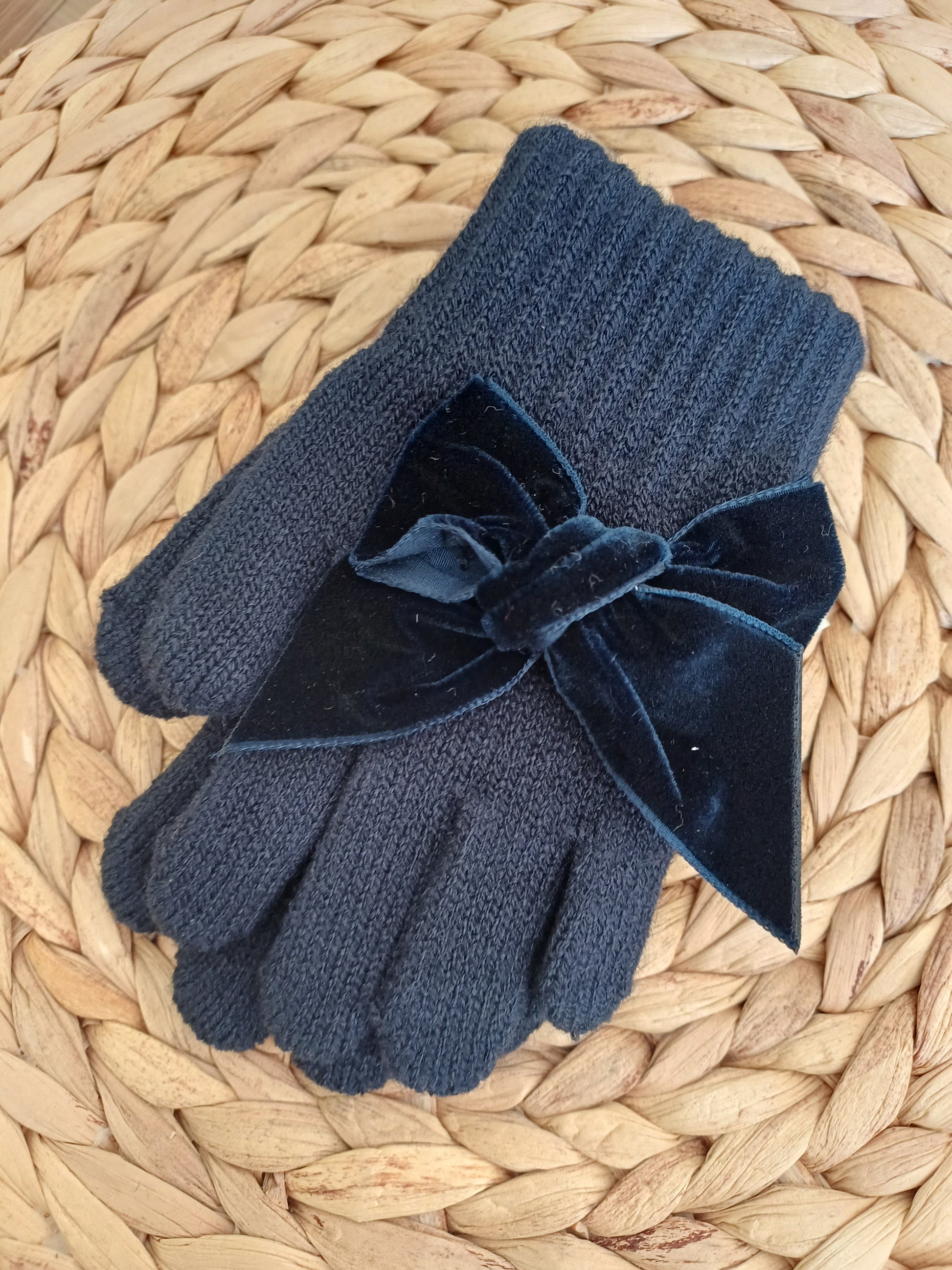 Delicati guanti in caldo cotone blu, impreziositi da un elegante fiocco in velluto tono su tono sul dorso di entrambe le mani. Morbidi e raffinati, offrono calore e stile, perfetti per completare con eleganza gli outfit delle giornate più fredde.