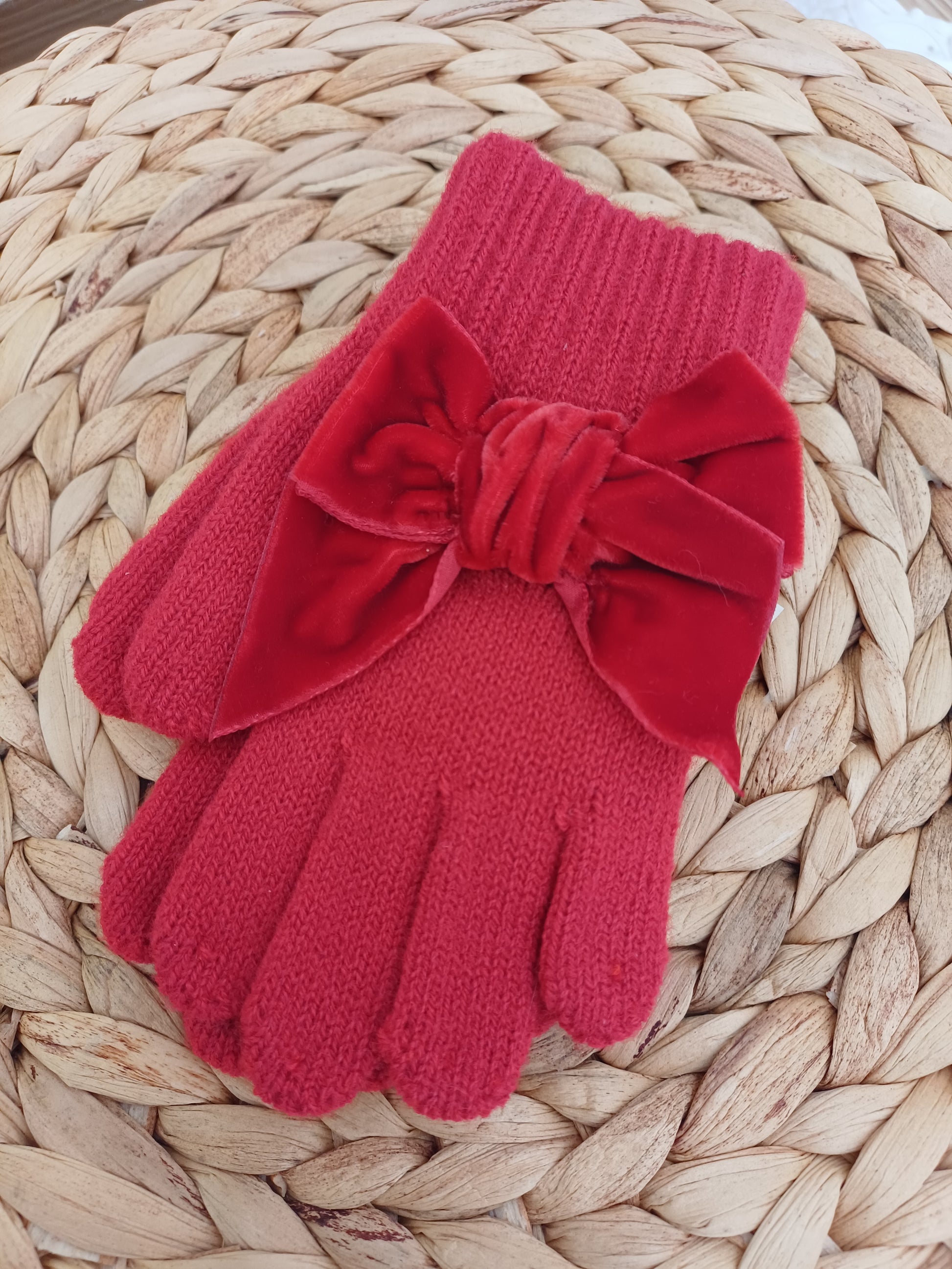Delicati guanti in caldo cotone rosso, impreziositi da un elegante fiocco in velluto tono su tono sul dorso di entrambe le mani. Morbidi e raffinati, offrono calore e stile, perfetti per completare con eleganza gli outfit delle giornate più fredde.