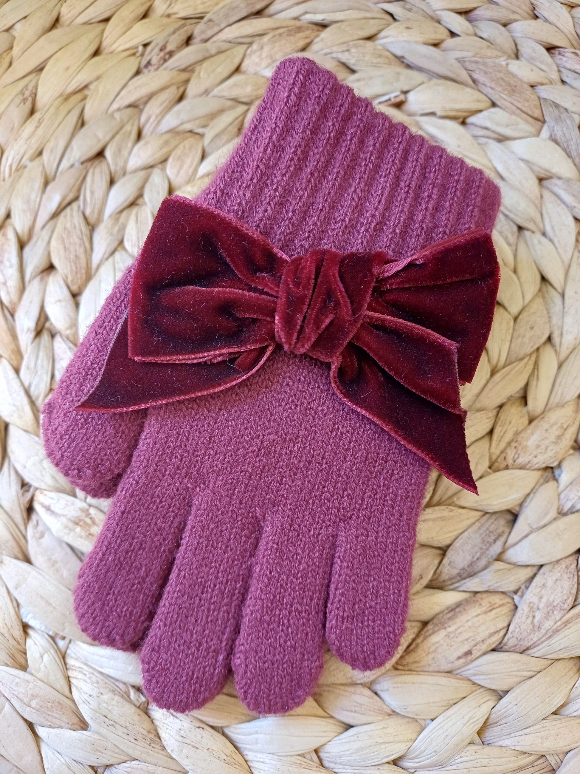 Delicati guanti in caldo cotone bordeaux, impreziositi da un elegante fiocco in velluto tono su tono sul dorso di entrambe le mani. Morbidi e raffinati, offrono calore e stile, perfetti per completare con eleganza gli outfit delle giornate più fredde.