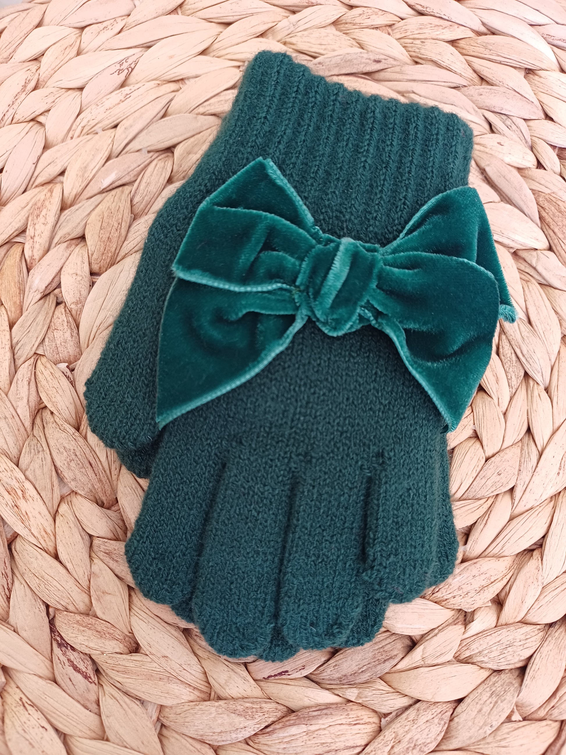 Delicati guanti in caldo cotone verde, impreziositi da un elegante fiocco in velluto tono su tono sul dorso di entrambe le mani. Morbidi e raffinati, offrono calore e stile, perfetti per completare con eleganza gli outfit delle giornate più fredde.