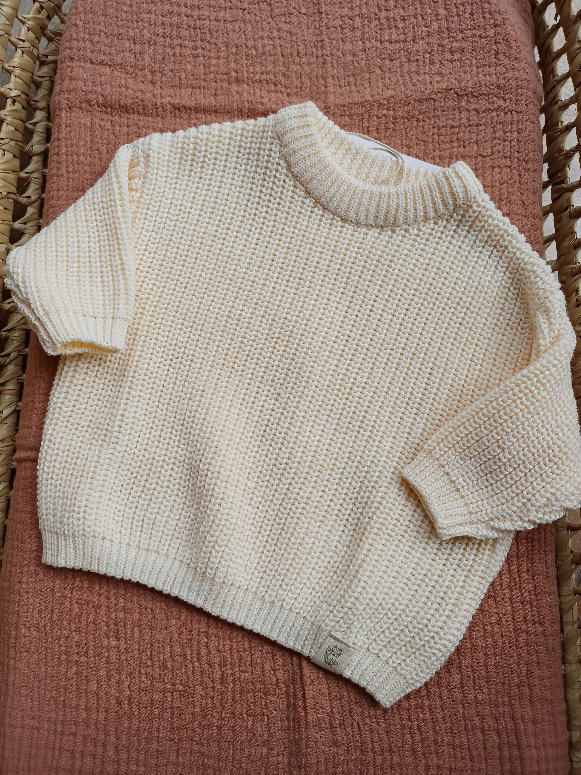 Maglioncino in caldo cotone color panna, morbido e confortevole sulla pelle. Dallo stile semplice ed elegante, è ideale per le giornate più fresche. Perfetto da abbinare a completini o tutine, offre calore e raffinatezza, mantenendo un look delicato e senza tempo per il neonato.