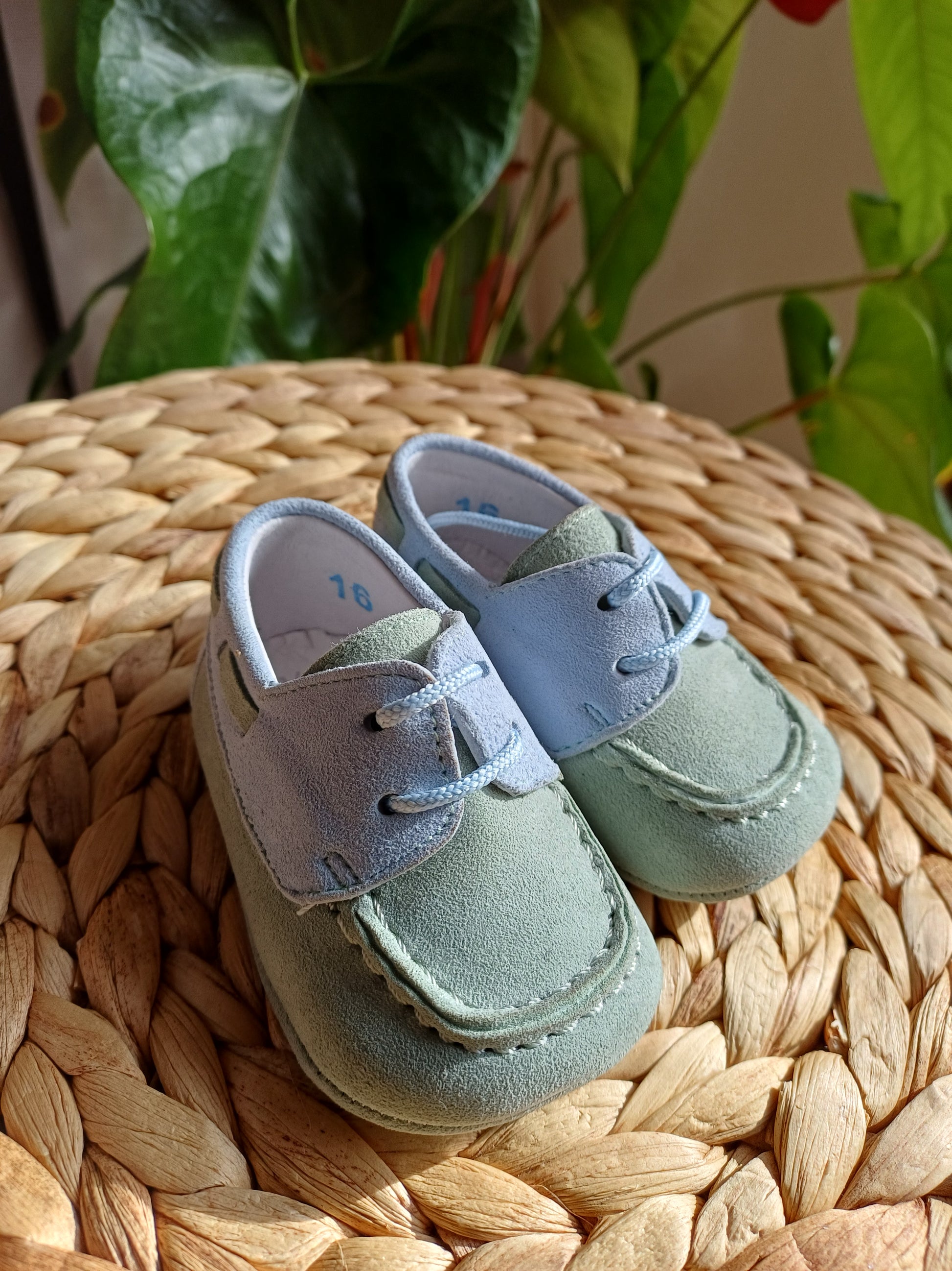 Scarpette culla scamosciate a mocassino verde e celeste chiaro, con interno in vera pelle e chiusura con lacci. Morbide, raffinate e confortevoli, ideali per i primi passi del neonato.
