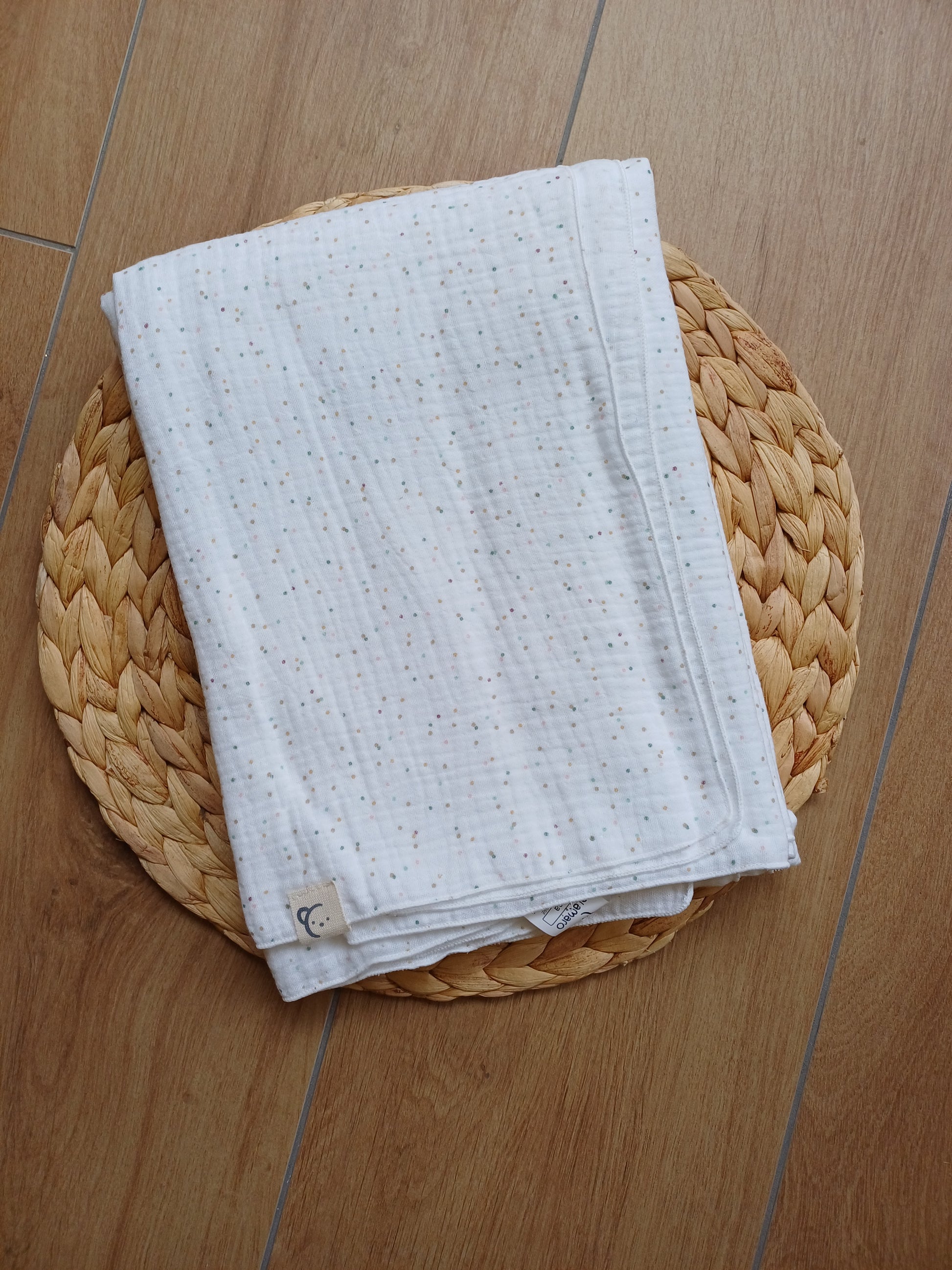 Mussola XXL in cotone, misura 125x120 cm. Fondo bianco con pois colorati distribuiti uniformemente. Morbida, traspirante e delicata sulla pelle, ideale per neonati, fasciature o coperture leggere. Design vivace e allegro, perfetto per aggiungere un tocco di colore e comfort quotidiano.