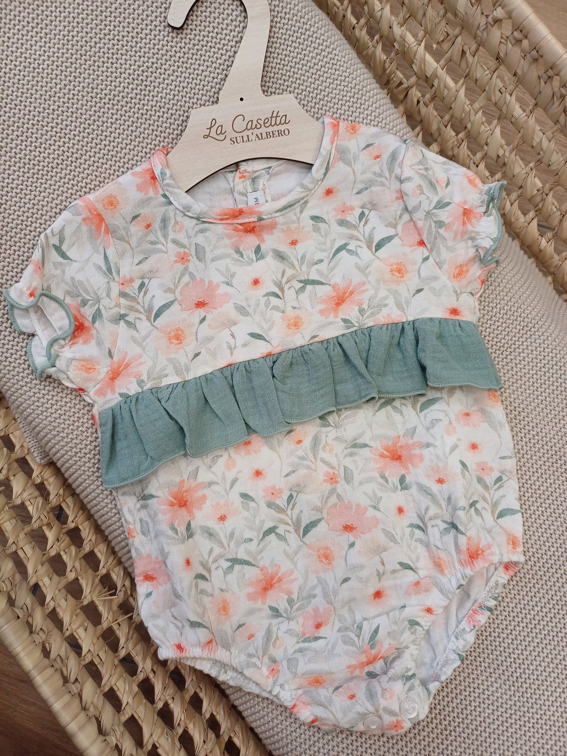 Pagliaccetto a manica corta con vivace fantasia floreale, arricchito da un elegante drappeggio verde sul davanti. Il taglio comodo esalta la figura con leggerezza, perfetto per un look estivo fresco e raffinato. Tessuto morbido e traspirante per un comfort che dura tutto il giorno.
