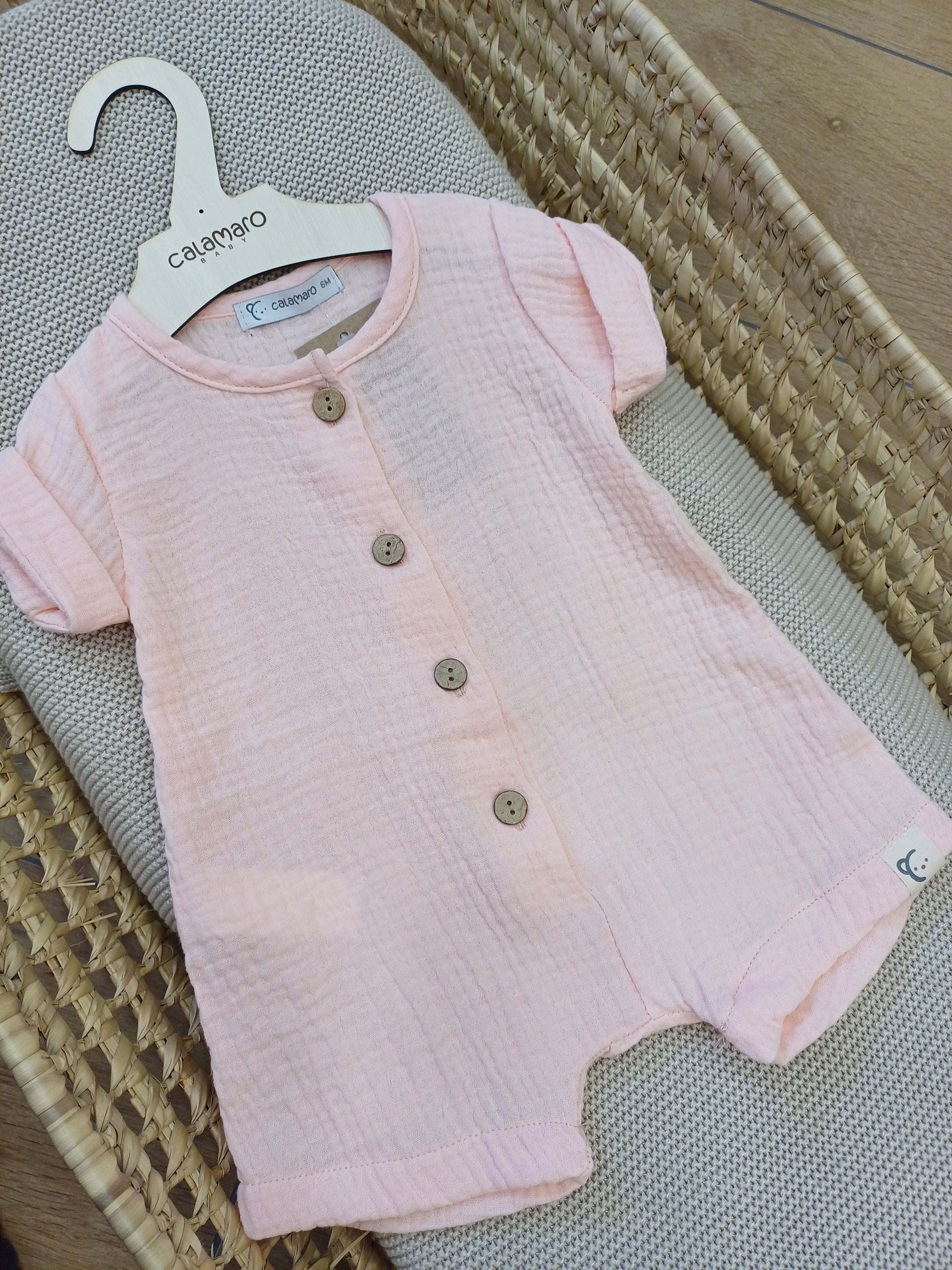 Pagliaccetto per bambini in mussola di cotone, leggero e traspirante. Morbido sulla pelle, ideale per le giornate calde. Design semplice ed elegante, arricchito da pratici bottoni in legno sul davanti per una facile vestizione. Perfetto per un look naturale e confortevole.