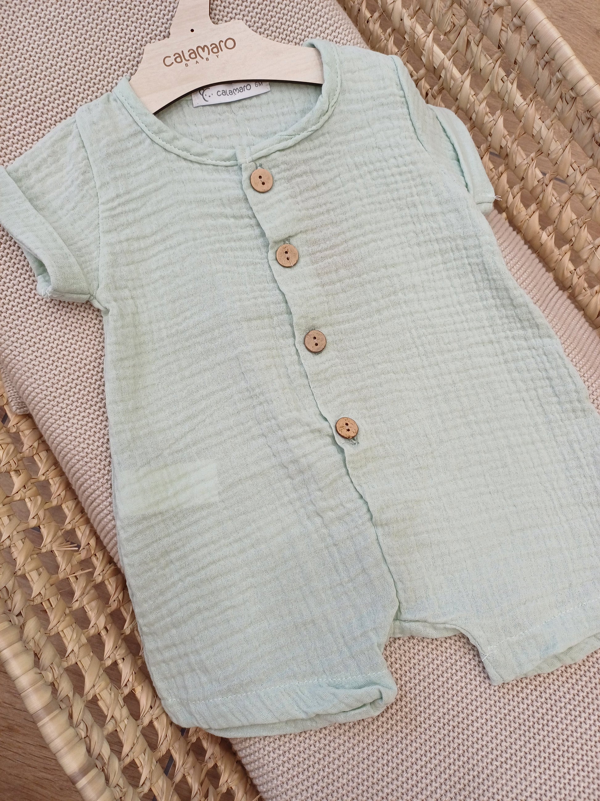Pagliaccetto per bambini in mussola di cotone, leggero e traspirante. Morbido sulla pelle, ideale per le giornate calde. Design semplice ed elegante, arricchito da pratici bottoni in legno sul davanti per una facile vestizione. Perfetto per un look naturale e confortevole.